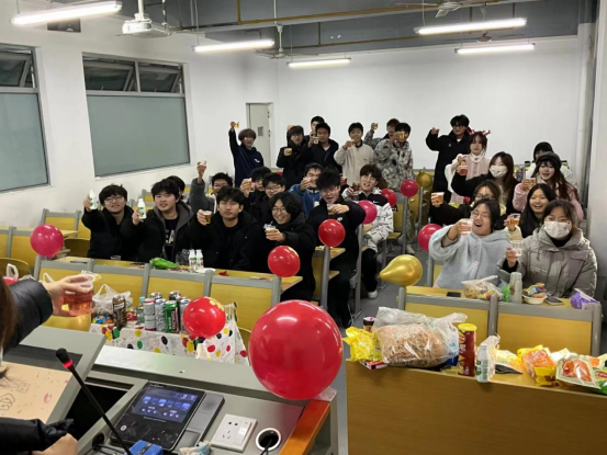 映入眼帘的是精致的PPT以及精美的板报,所画所述皆是欢颂新年的到来;再看那满座的零食,是老师和学生们一同带来所“堆砌”而成;金红的气球更为忘年会营造一种温馨而热闹的氛围感。