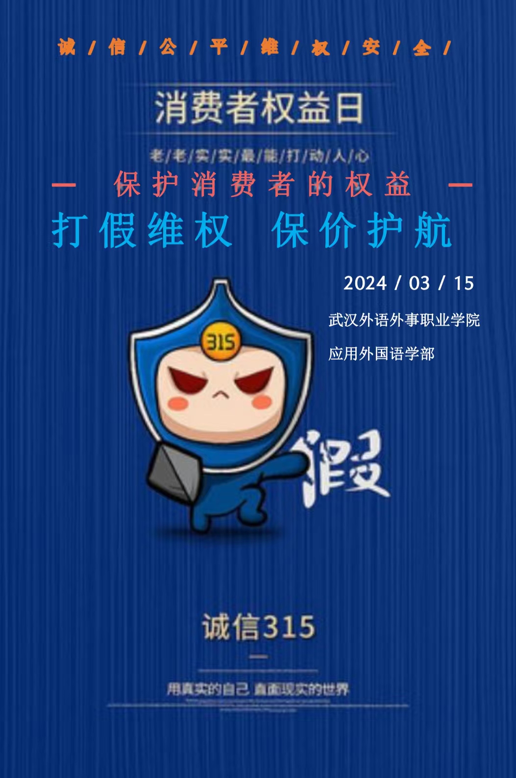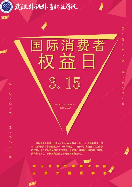 2024年3月11日,应用外国语学部为提高同学们的消费权益保护意识,了解自身的合法权益,增强法律观念,展现当代大学生风貌,树立社会诚信消费观,共筑校园权益防护墙。在同学们的积极参与下,本次“315国际消费者权益日”海报设计活动落下帷幕。本次收集的海报,无一不体现了同学们对于维权活动和自身权益的重视,秉持为自己维权的初衷。