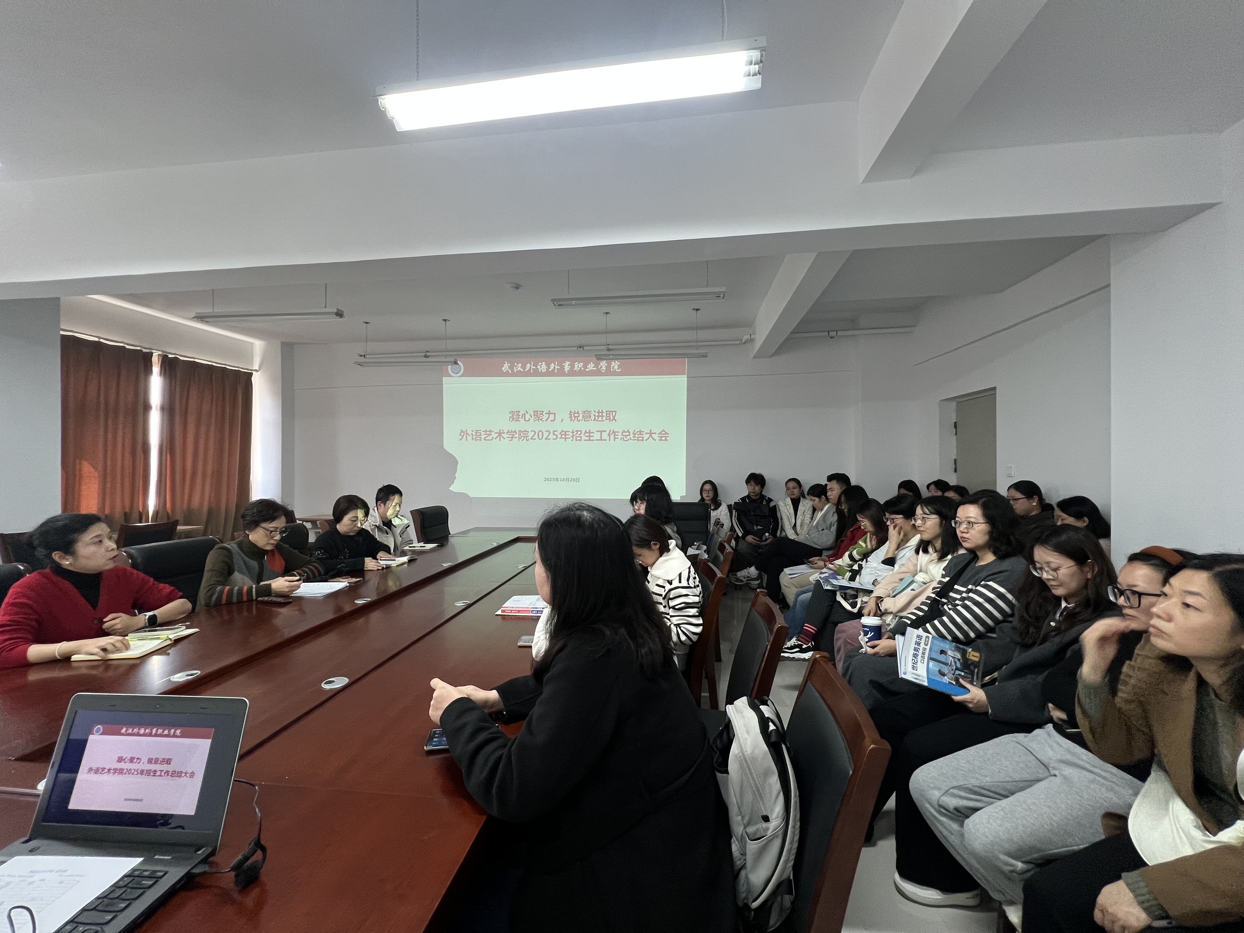 (通讯员:刘妮) 2025年10月28日中午12时30分,外语与艺术学院在木森楼411会议室隆重召开学院2025年招生工作总结大会。学院全体教职工齐聚一堂,共同回顾总结招生工作,并展望未来发展方向。