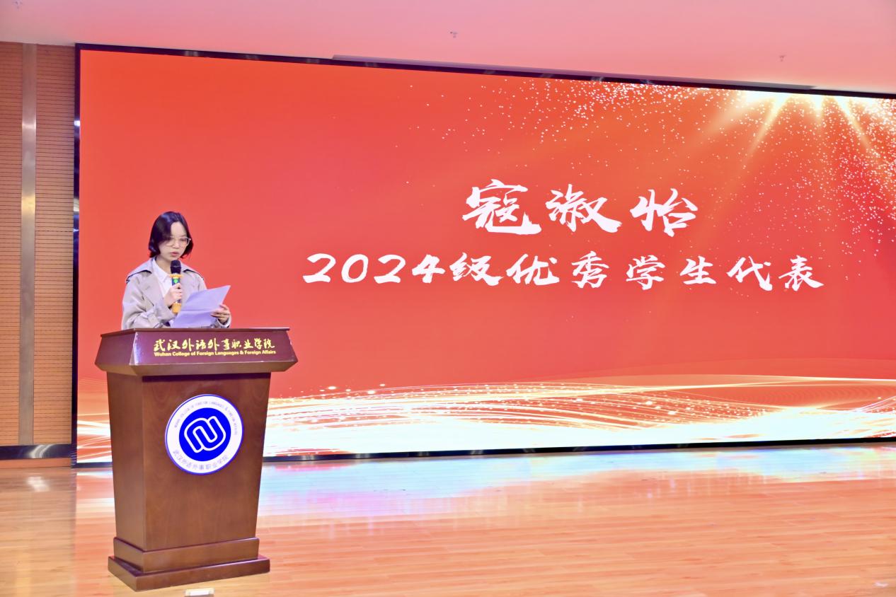 综合素质标兵寇淑怡同学结合自身实践经历,阐述了对外语学习与综合素质提升的理解,她认为奖项是肯定更是起点,呼吁同学们保持学习热情与探索勇气,在语言与艺术的融合中发现更广阔的世界。