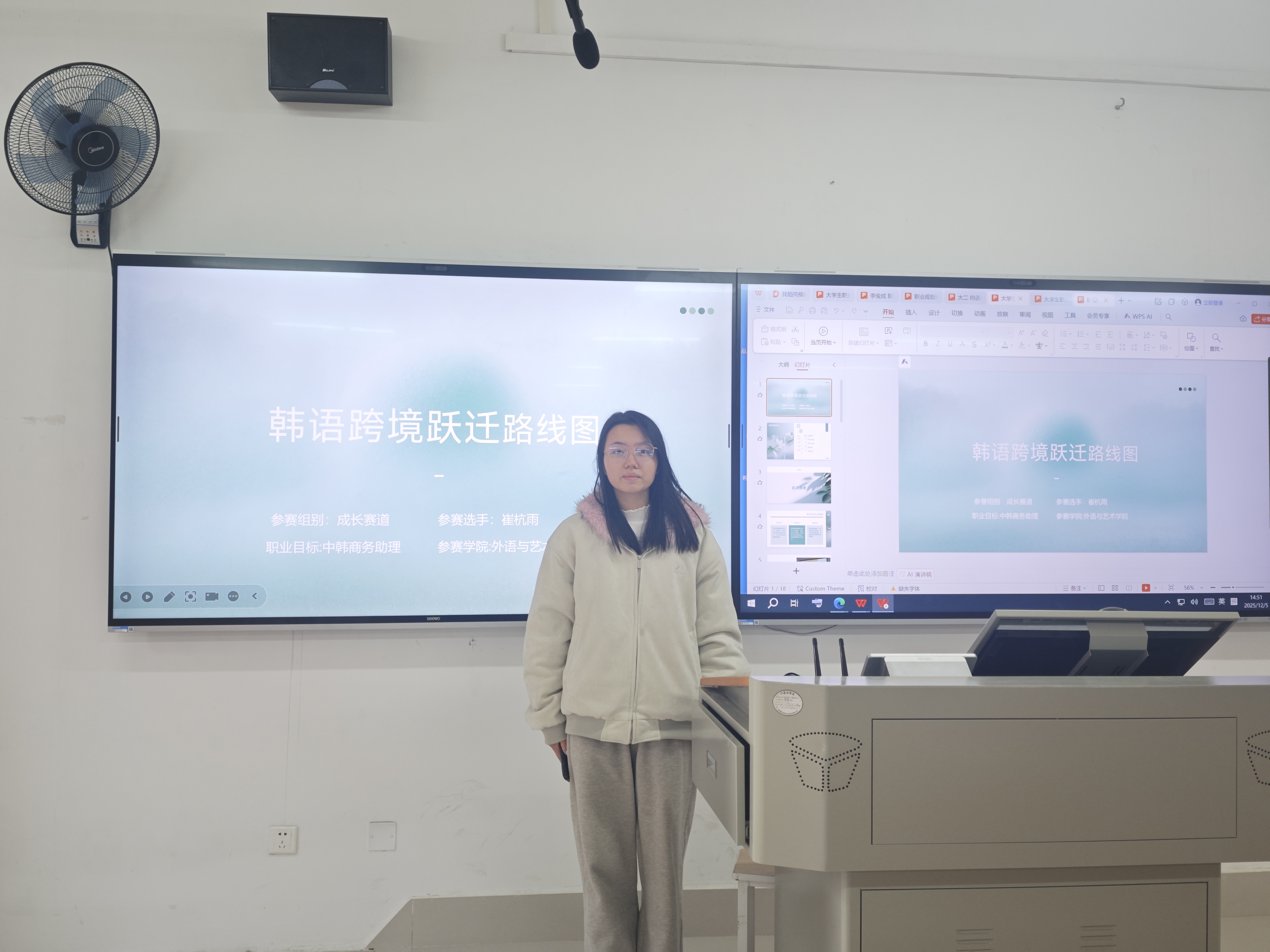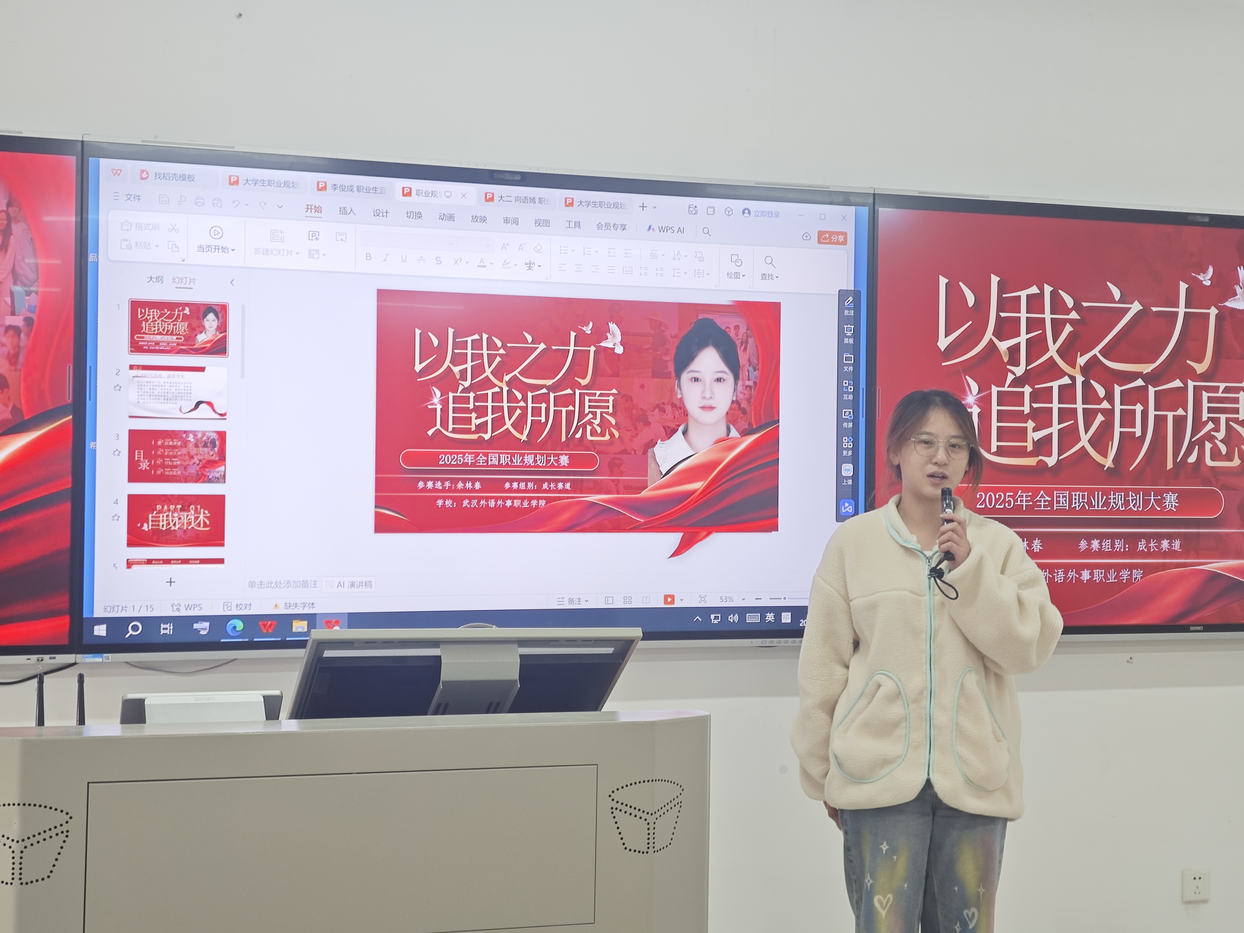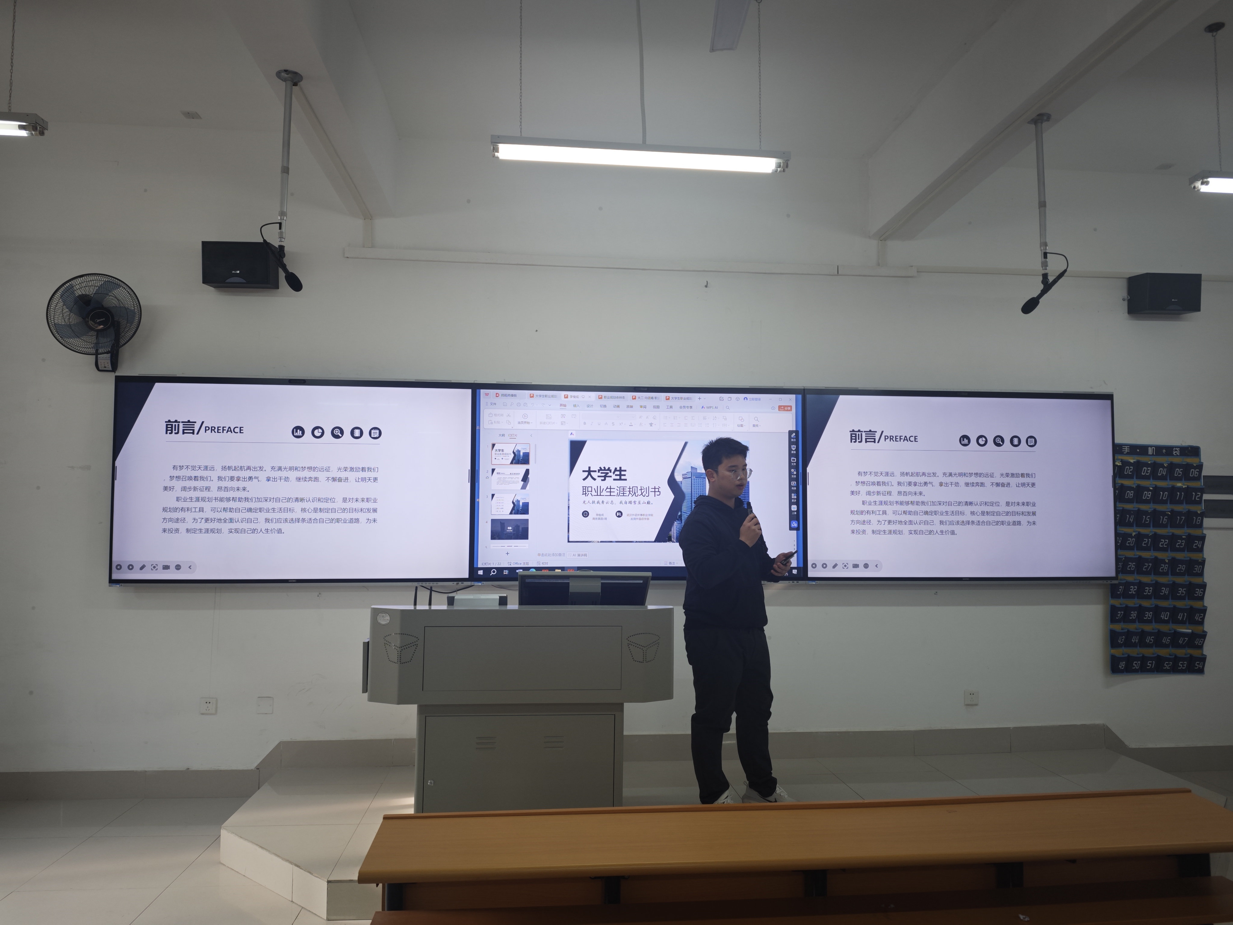 现场选拔以“职业规划阐述”与“简短问答”相结合的方式进行。选手们围绕自我认知、专业适配分析、职业目标定位以及短期行动计划等核心内容,通过PPT清晰展示了个人职业规划思路。从深耕本专业相关岗位,到积极探索跨领域发展可能,同学们结合自身兴趣与专业特长,生动阐述了对未来职业发展的初步构想。
