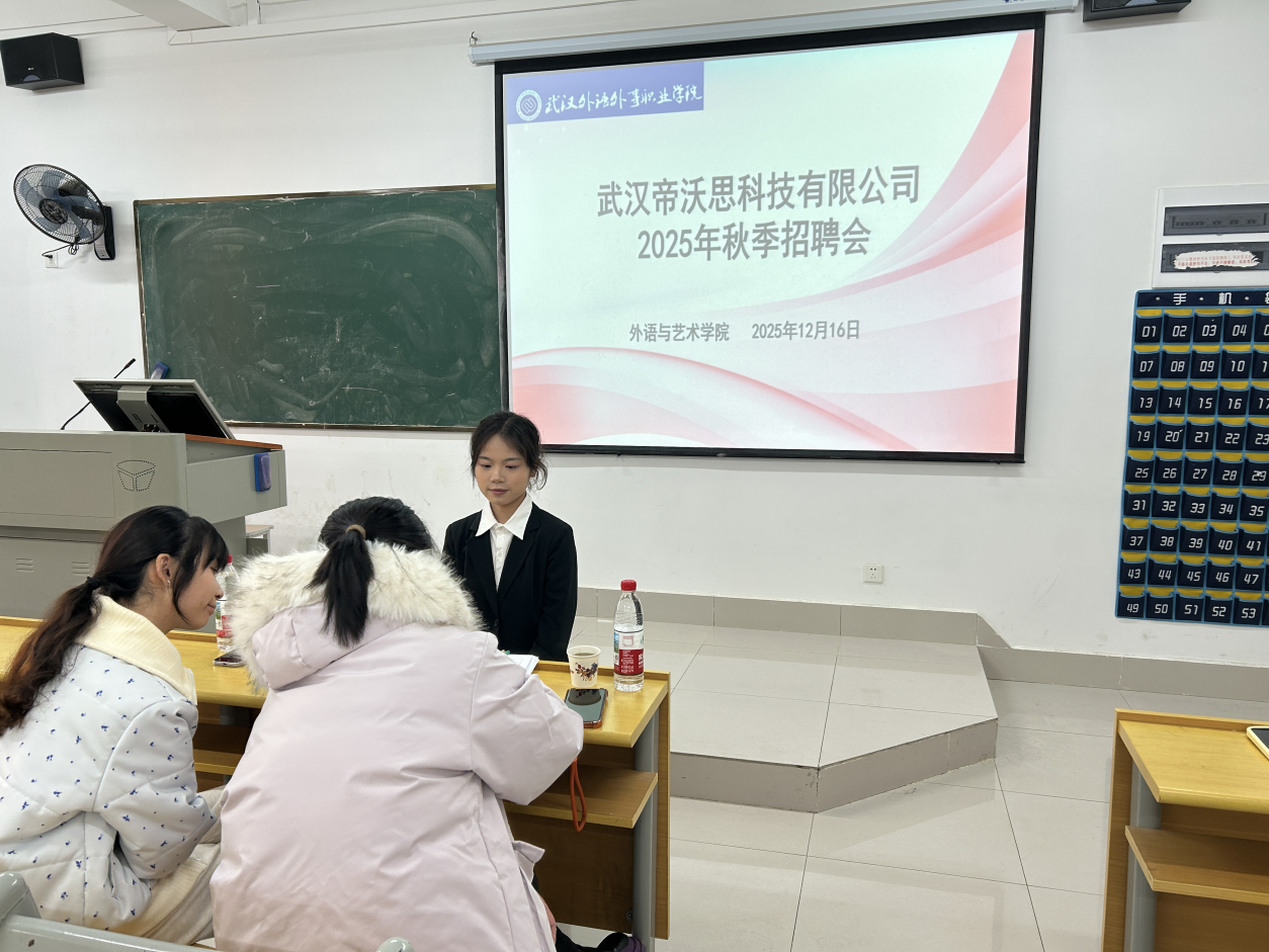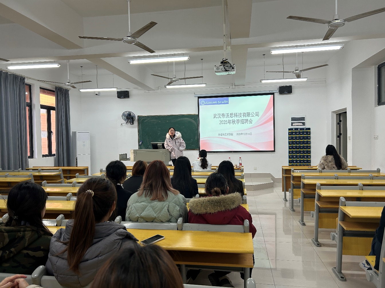 (通讯员:刘林娴)2025年12月16日,专注于跨境英语直播的“武汉帝沃思科技有限公司”走进外语与艺术学院举办实习生专场招聘会,针对2024届英语专业学子推出多个实习岗位,以“理论+实践”的培养模式吸引众多学子参与,为英语专业学生搭建起专业能力转化的实战平台。
