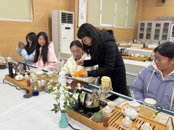 活动伊始,老师们特邀旅游与管理学院国家一级茶艺师吴凤鸣老师为大家讲解茶艺知识。“茶台摆放讲究‘简而有序’,这套盖碗的盖为天、碗为人、托为地,暗含天地人和的理念。”吴老师手持茶具,从茶台布局的礼仪规范讲起,逐一介绍了盖碗、公道杯、品茗杯等茶具的功能与使用方法。随后,她结合实物向同学们讲解六大茶类的区别,从绿茶的清新、红茶的醇厚到乌龙茶的馥郁,每一款茶都配上简单的品鉴小知识,让大家快速建立对茶的认知。