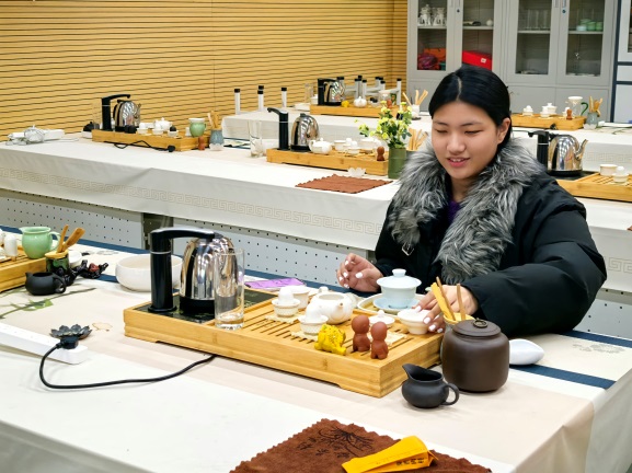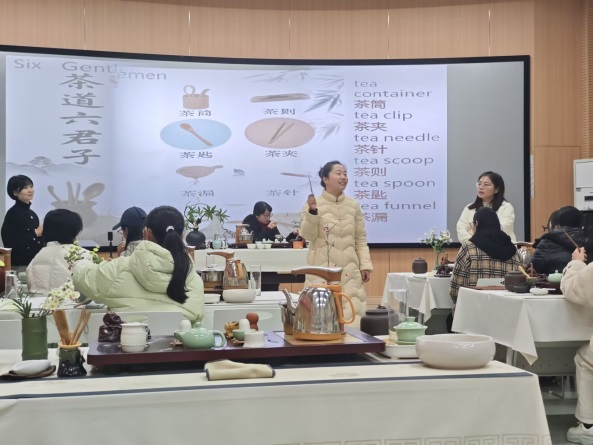 (通讯员:赵秀丽)茶香袅袅润心田,指尖生花传非遗。2025年12月23日,学校茶艺实训室内暖意融融,商务英语系陈淑媛老师、李旭晴老师、肖晏老师和赵秀丽老师联合四个班级(24级商务英语1班、24级商务英语3班、24级应用英语1班和25级商务英语1班)在此共同举办特色文化体验活动,带领同学们沉浸式感受茶文化的雅致与传统手工艺的魅力,让传统文化在校园里落地生根。