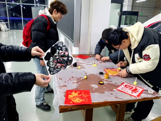 茶香未散,手工体验区已热闹起来。24级商英3班的李俊成同学和商英1班的温祖海同学早已将彩纸、剪刀、拓板、颜料等工具摆放整齐,耐心等待大家前来参与。“剪纸要先对折整齐,剪曲线的时候慢慢转手腕,这样边缘才光滑。”李同学拿着提前剪好的窗花样品,一步步讲解基础技巧。温同学则在拓画区示范:“把模板固定好,蘸颜料要轻,按压的时候均匀用力,图案才清晰。”同学们分成小组,有的跟着学剪窗花、福字,有的专注于拓印吉祥图案,实训室里不时传来剪刀开合的清脆声响和欢快的交流声。遇到剪不好的地方,李同学和温同学便手把手指导;完成作品后,大家还互相展示分享,原本空白的彩纸和宣纸上,渐渐绽放出一个个精致的剪纸作品、一幅幅色彩鲜亮的拓画,每个人的脸上都洋溢着成就感。