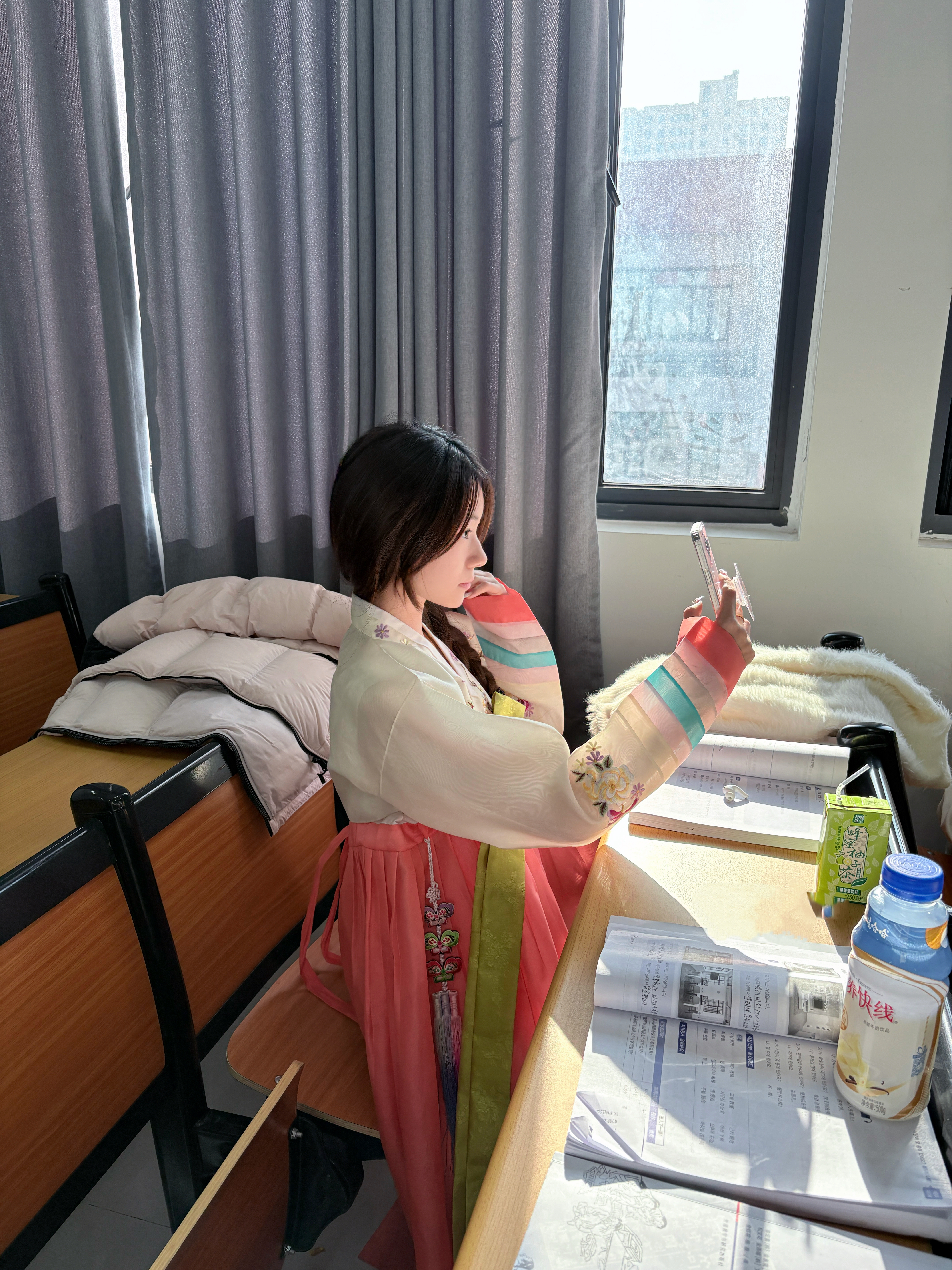 走进课堂,随处可见轻松活泼而又充满文化气息的学习场景。在“韩服体验”环节,学生们身着色彩典雅、线条优美的传统韩服,亲手系结衣带、整理裙摆,在穿戴过程中直观感知韩国服饰的审美特色与文化内涵,语言学习与人文体验自然交融。