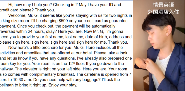 《酒店英语》课程重视从听说读写多方面提高学生的英语表达能力,使学生掌握实用的酒店知识,熟悉酒店办理入住、退房、礼宾服务、餐饮服务等各项业务,能熟练运用英语在各类企事业单位从事涉外礼仪接待,酒店服务与管理等工作。课程设计中教师通过线上线下混合式教学,课中通过视频展示办理入住时标准的服务用语,讲解发音特点与陌生词汇。课后以录音作业的方式,督促学生多加模仿示例视频,检查学生对酒店常见场景用语的发音与流利表达程度。
