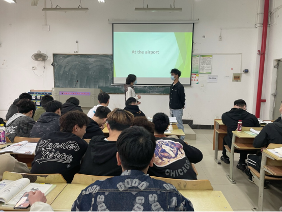 英语口语课堂上教师创设在机场情景,学生积极参加口语实践,课堂氛围轻松愉快,学生取得了较好的学习效果。