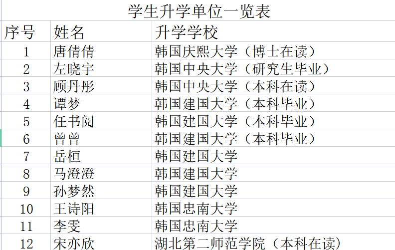 应用韩语专业毕业生在积极就业的同时,也有部分学生通过专升本或者赴韩留学来提升自己的学历,下图为我校部分留学生信息,往届学生们所就读的韩国庆熙大学,中央大学,建国大学均为韩国名校,其中韩国建国大学和我校为姊妹学校,让提升学历变得更加容易,只要学好韩语,就可选择心仪学校,心仪专业来提升自己学历。