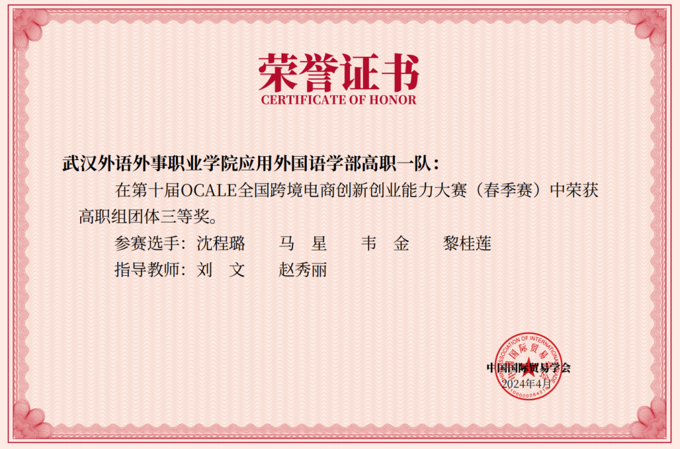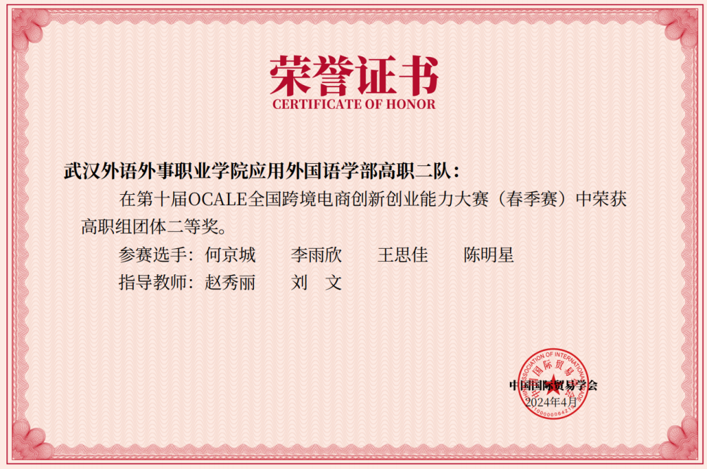 新闻网讯(通讯员刘文 何京城)为期3天的OCALE全国跨境电商创新创业能力大赛于4月27日下午圆满结束。我院应用外国语学部商务英语专业8名学生组成两支队伍参赛,凭借出色的表现分别夺得国家二等奖、三等奖。