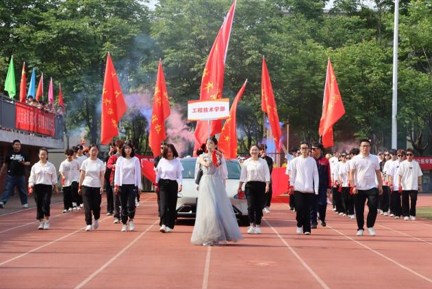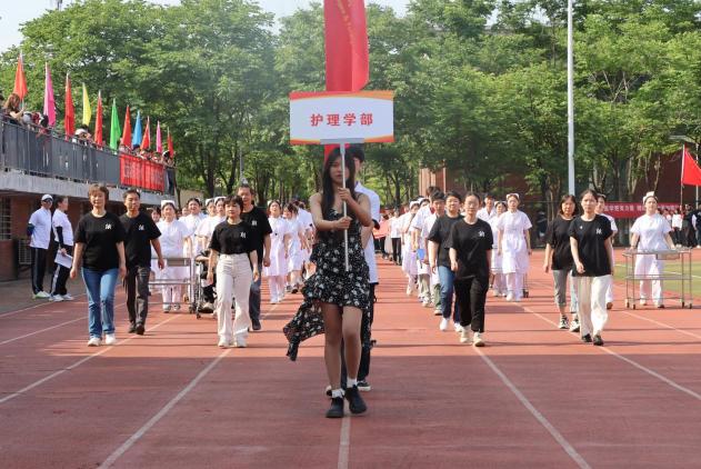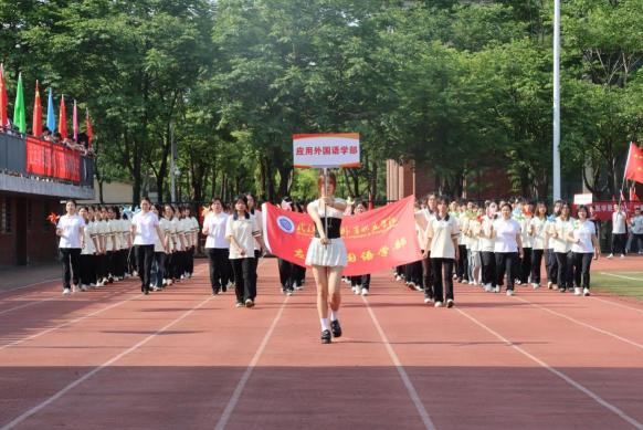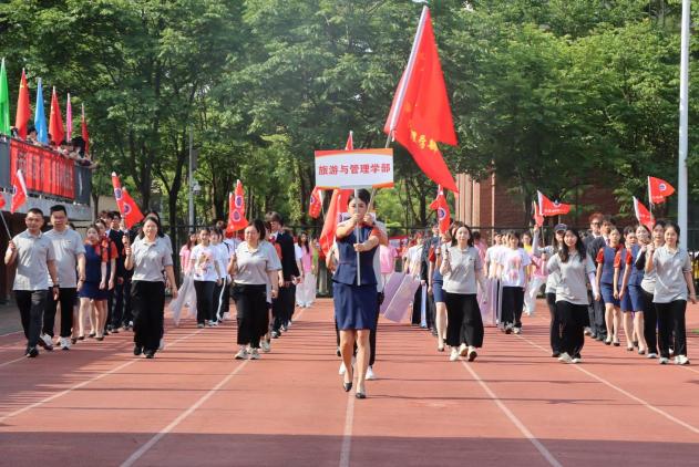 迎着微风,伴着朝阳,应用外国语学部、旅游与管理学部、财经与商贸学部、信息技术学部、护理学部、工程技术学部由辅导员和学生组成的方阵各自巧妙地将本专业特色融入方阵设计当中,他们身着独具特色的服装,手持特制的道具,迈着铿锵有力的步伐,高喊激昂的口号依次入场,接受主席台的检阅。整齐的队伍、富有创意的入场方式充分展现了我校师生奋勇争先的良好精神面貌。
