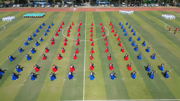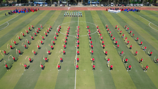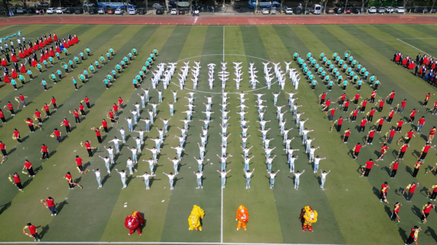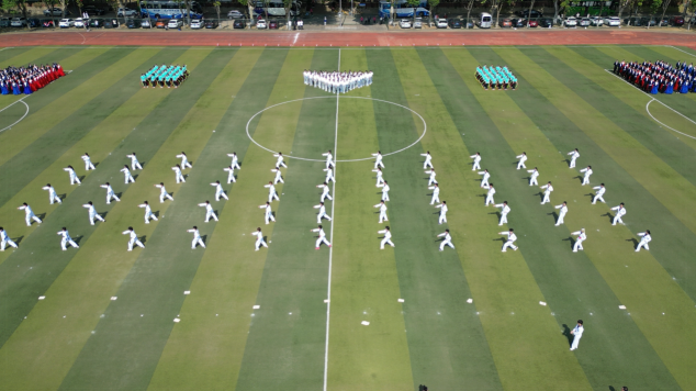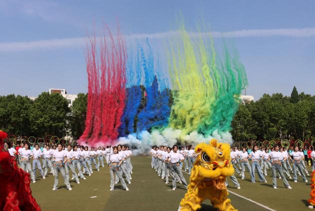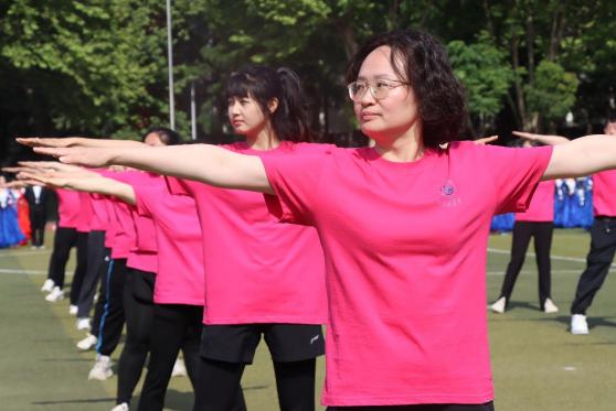 100位教师共同献上的团体操,“山河壮丽”“同心共圆”“时代强音”“强国有我”四大篇章的精彩大联排,在运动场汇聚成一道道独具特色的风景线。