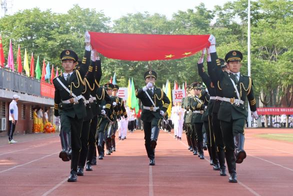 8时许,伴随着激昂的《运动员进行曲》,国旗护卫队迈着铿锵有力的步伐,护送着鲜艳的五星红旗从主席台走过,仪仗方阵和彩旗方阵紧随其后。