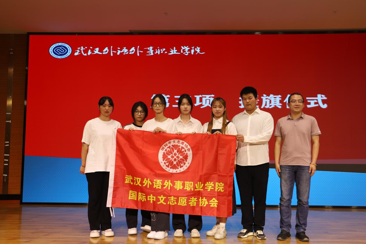 学校团委办公室负责人孙伟为志愿者代表授旗,2023级志愿者代表上台宣誓,表达志愿者为国际中文教育事业贡献力量的决心和信心。