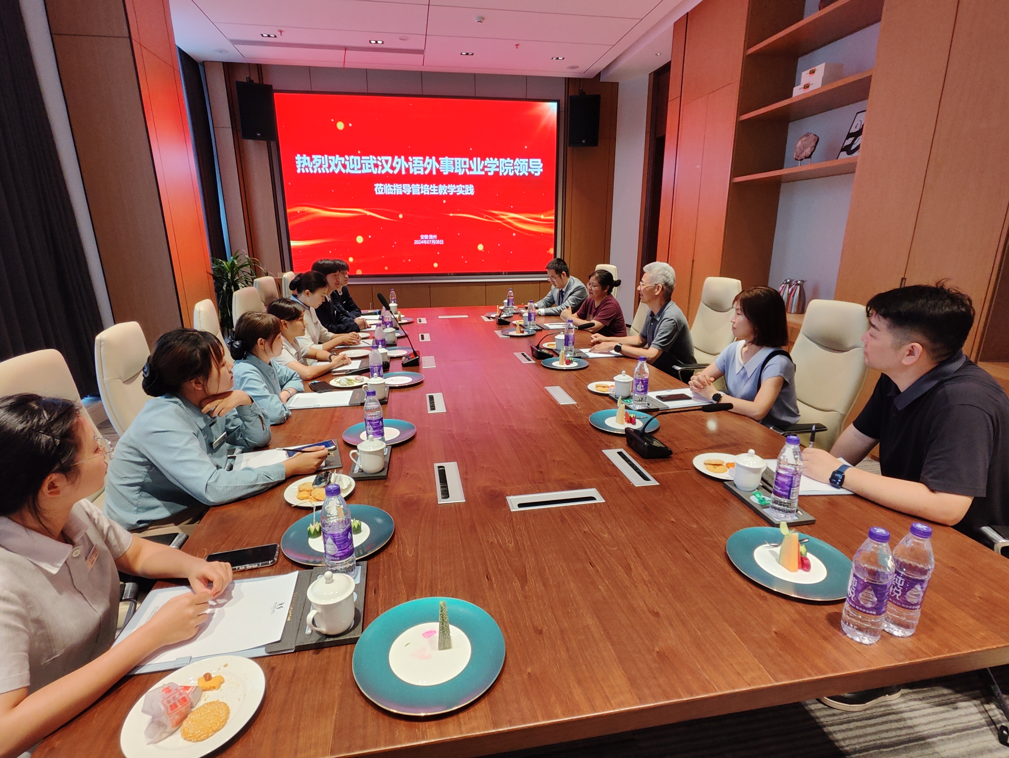 新闻网讯(通讯员 蔡霞)2024年7月8日,武汉外语外事职业学院校长盛建龙带领旅游与管理学部主任张欣,副书记孙文,综合办老师,管理系老师共赴安徽滁州金鹏文旅集团访企拓岗,并看望正在酒店实习的七名优秀管培生。