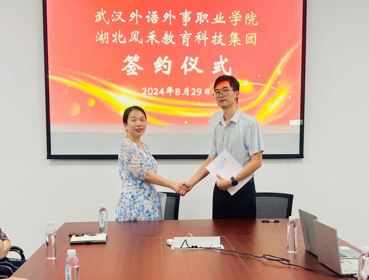 新闻网讯(通讯员 张莹)8月29日下午,我校信息技术学部与湖北风禾教育集团在校内隆重举行校企合作签约仪式,标志着校企双方在人才培养、实践教育及社会服务等领域迈出了坚实的一步。湖北风禾教育集团总经理金圣茗、直播业务负责人邹俊泽等企业代表、我校副校长刘丹、教务处处长张凤秦、实训中心主任许健、信息技术学部行政管理及数字媒体专业的全体教师、辅导员出席此次签约仪式。