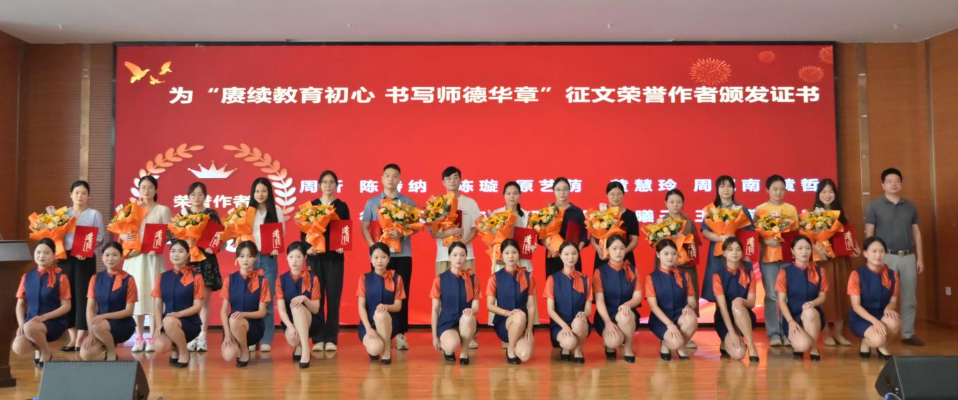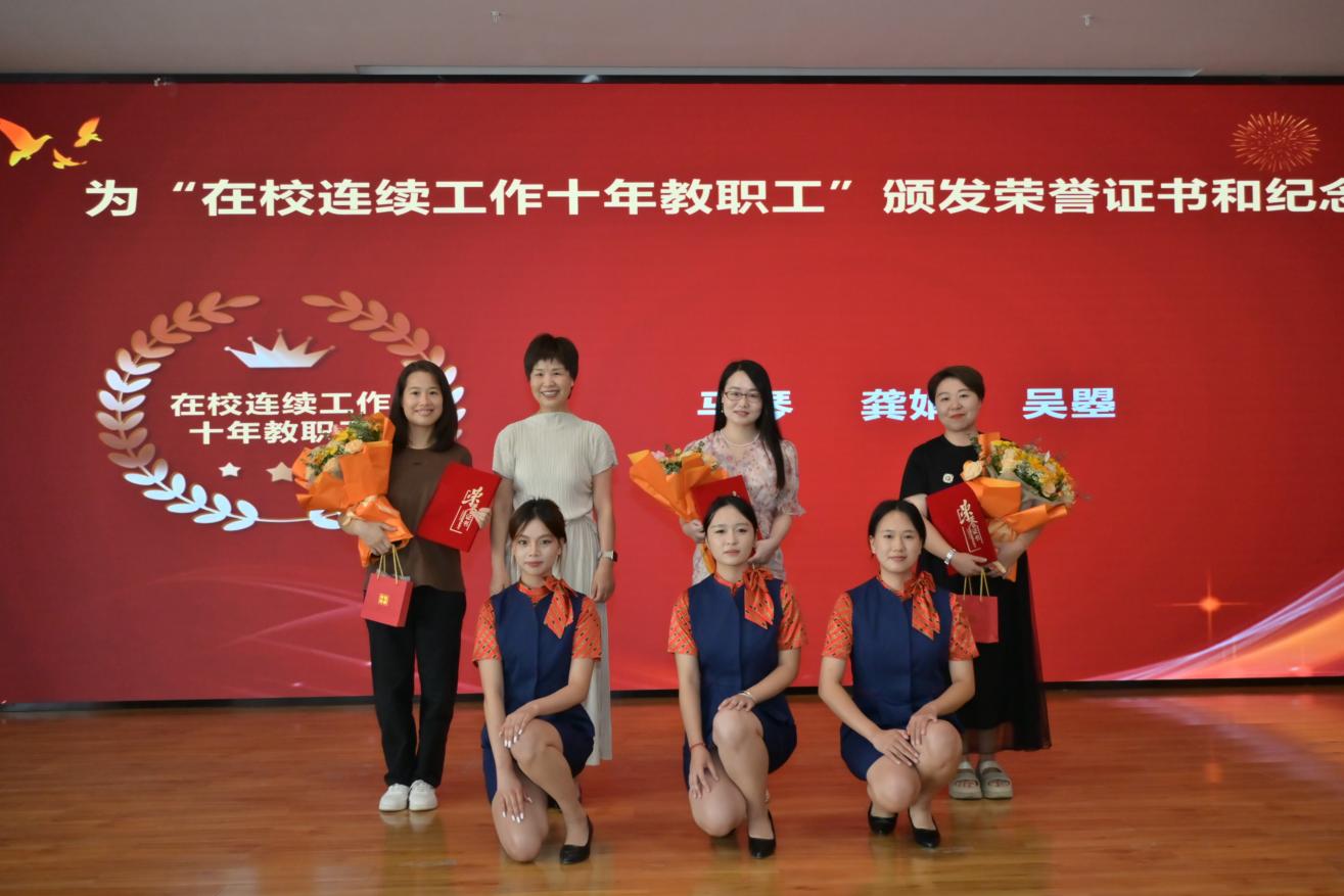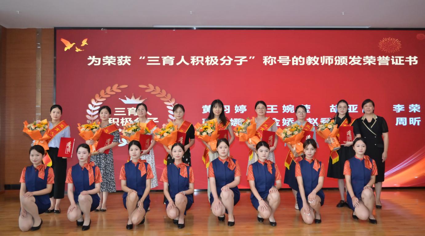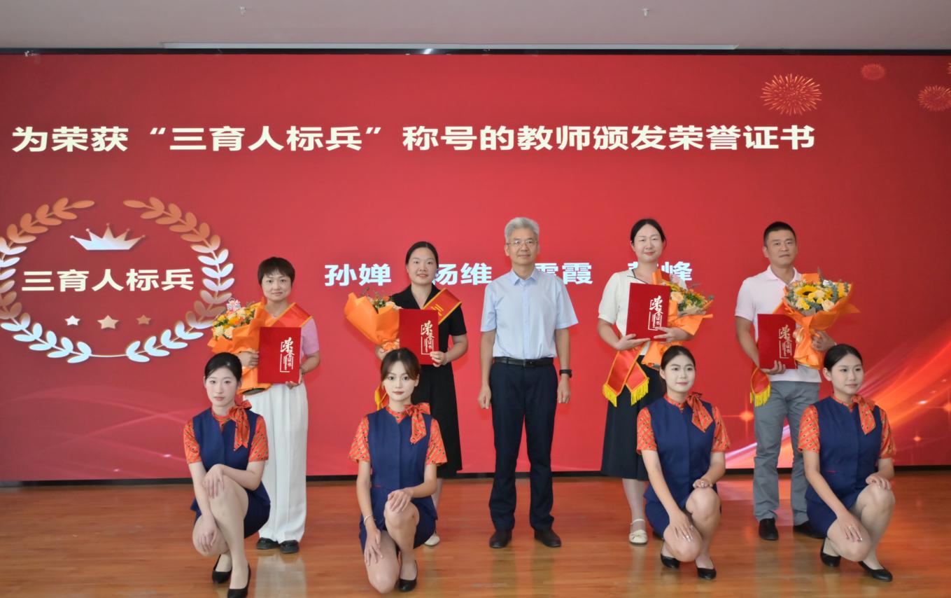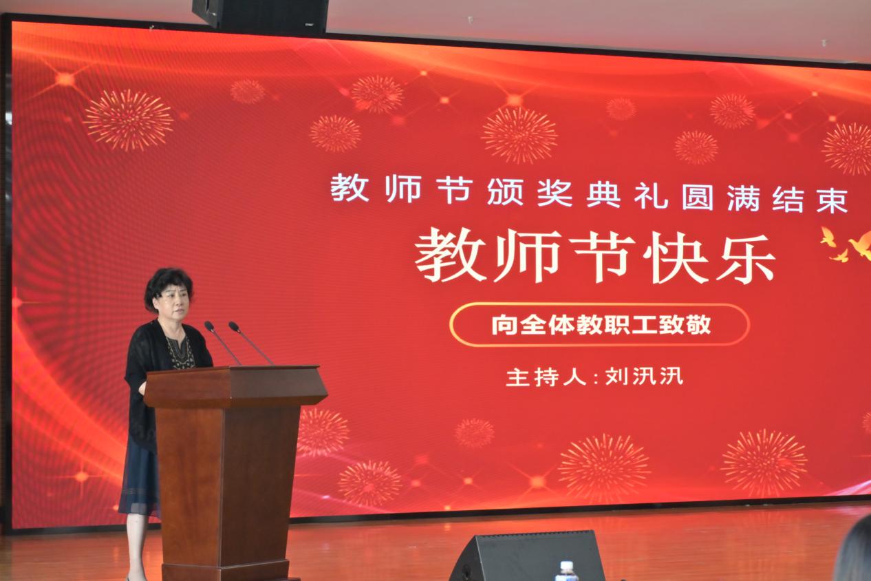 党委副书记杜磊宣读《关于表彰“赓续教育初心 书写师德华章”征文荣誉作者、“在校连续工作十年以上教职员工”、“三育人标兵”、“三育人积极分子”的决定》。党委副书记杜磊为“赓续教育初心 书写师德华章”征文荣誉作者周昕等14人颁发证书;学校董事长、工会主席吴翠红为在校连续工作十年的教职工吴曌等3人颁发荣誉证书和银质奖章;校长盛建龙为荣获“三育人标兵”称号的教师孙婵等4人颁发荣誉证书;副校长刘丹为荣获“三育人积极分子”称号的教师张丽娜等9人颁发荣誉证书。