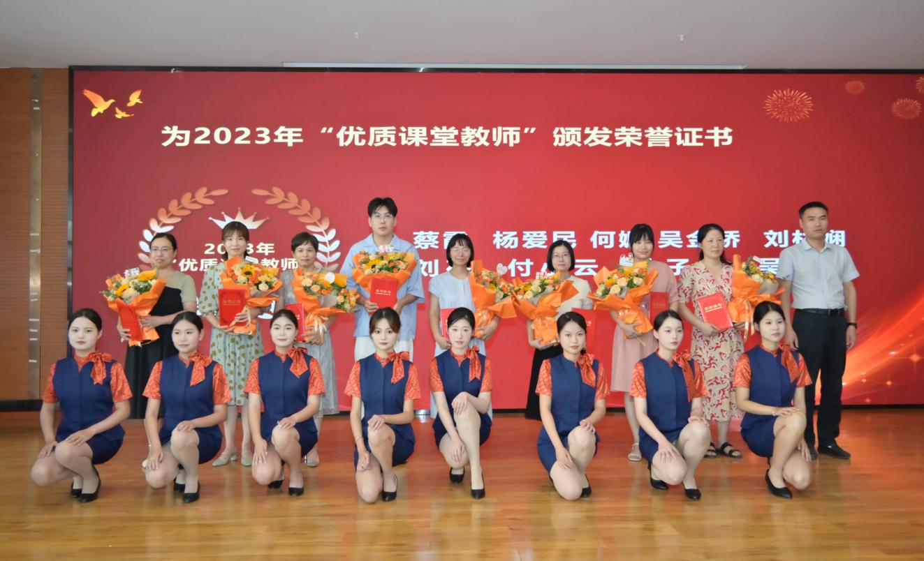 副校长刘丹宣读《关于公布 2023 年“优质课堂教师”评选结果的通知》。学校授予蔡霞等9人“优质课堂教师”称号,副校长陶智勇为 2023 年“优质课堂教师”颁发荣誉证书。