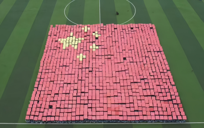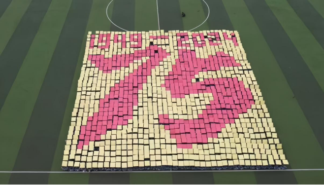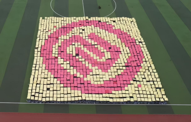 随后,花样方阵整齐列队,学生们手持红、黄两色板,紧密合作、精准配合,迅速在会场中央变换出国旗、校徽、天安门等图案,以及“1949-2024”、“盛世华诞”、“中国梦”等字样,深情表达了对祖国的热爱与祝福。整个表演不仅展现了学生们深厚的爱国情怀,更彰显了我校团结向上、追求卓越的校风,赢得了现场掌声连连。