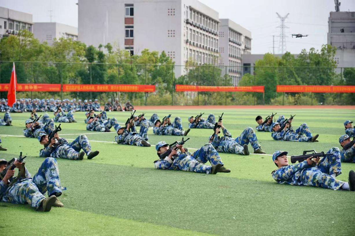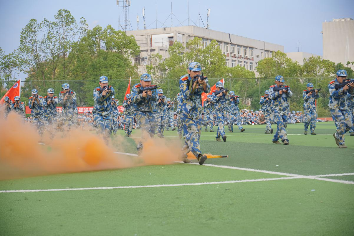 战术方阵的同学们展示了举枪、滑跪、突击等一系列战场动作,他们时而匍匐前进,紧贴地面,动作敏捷;时而迅速起身,瞄准目标,眼神坚定。战术方阵还融入了“军与民”的救援场景以及“兵与匪”的周旋情节,生动地展现了团队协作精神、坚韧意志和对国家的忠诚。