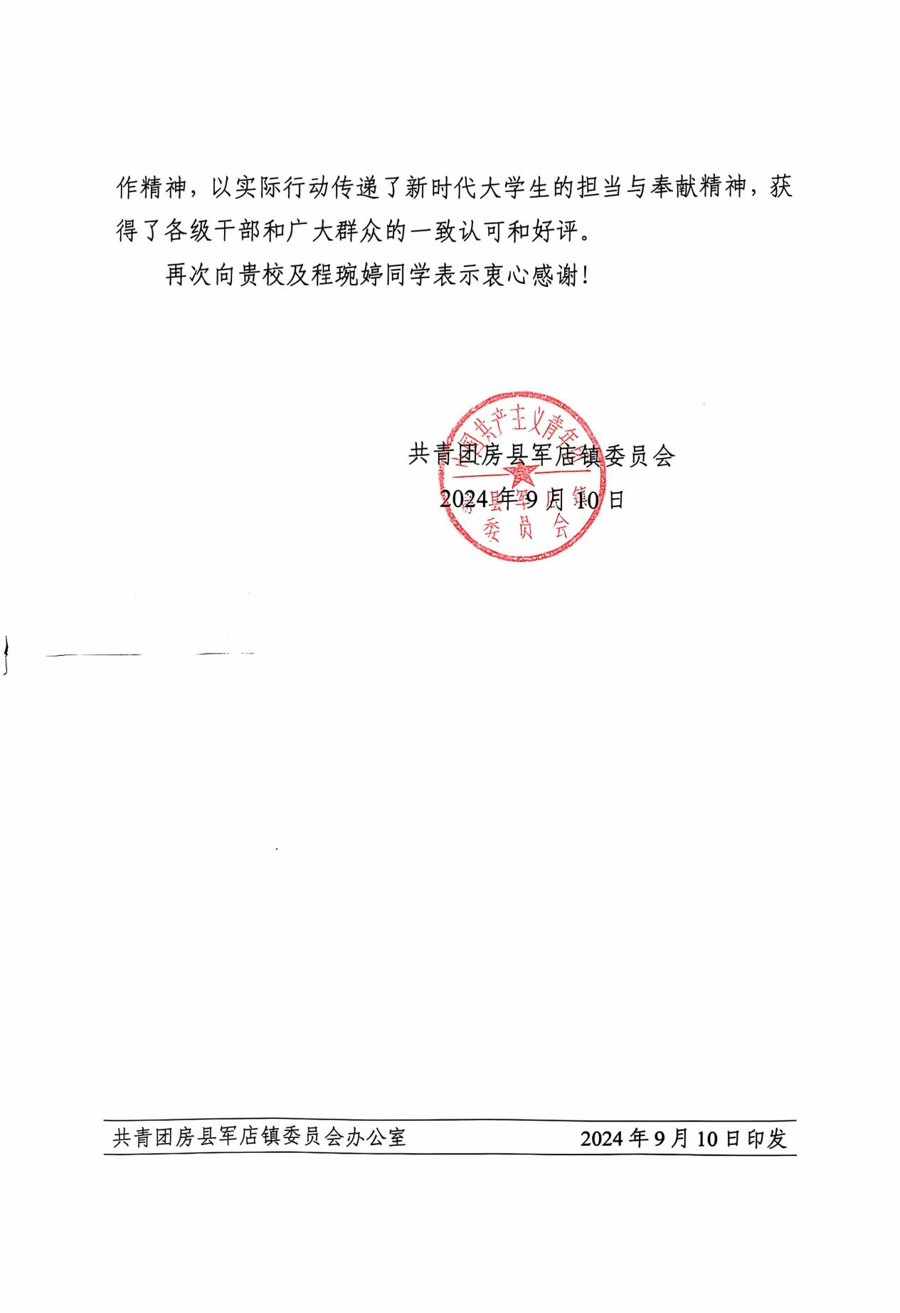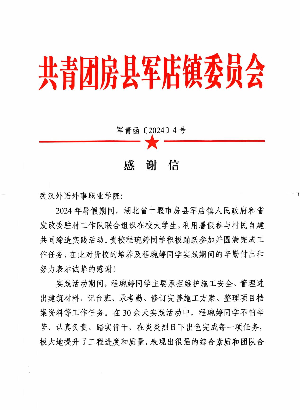 长达30余天的实践活动中,程琬婷同学不畏艰辛、认真负责、踏实肯干。她的优异表现不仅赢得了湖北省十堰市房县军店镇人民政府和省发改委驻村工作队的高度认可,还特别撰写了感谢信发送至我校,对程琬婷同学进行了表彰与感谢。