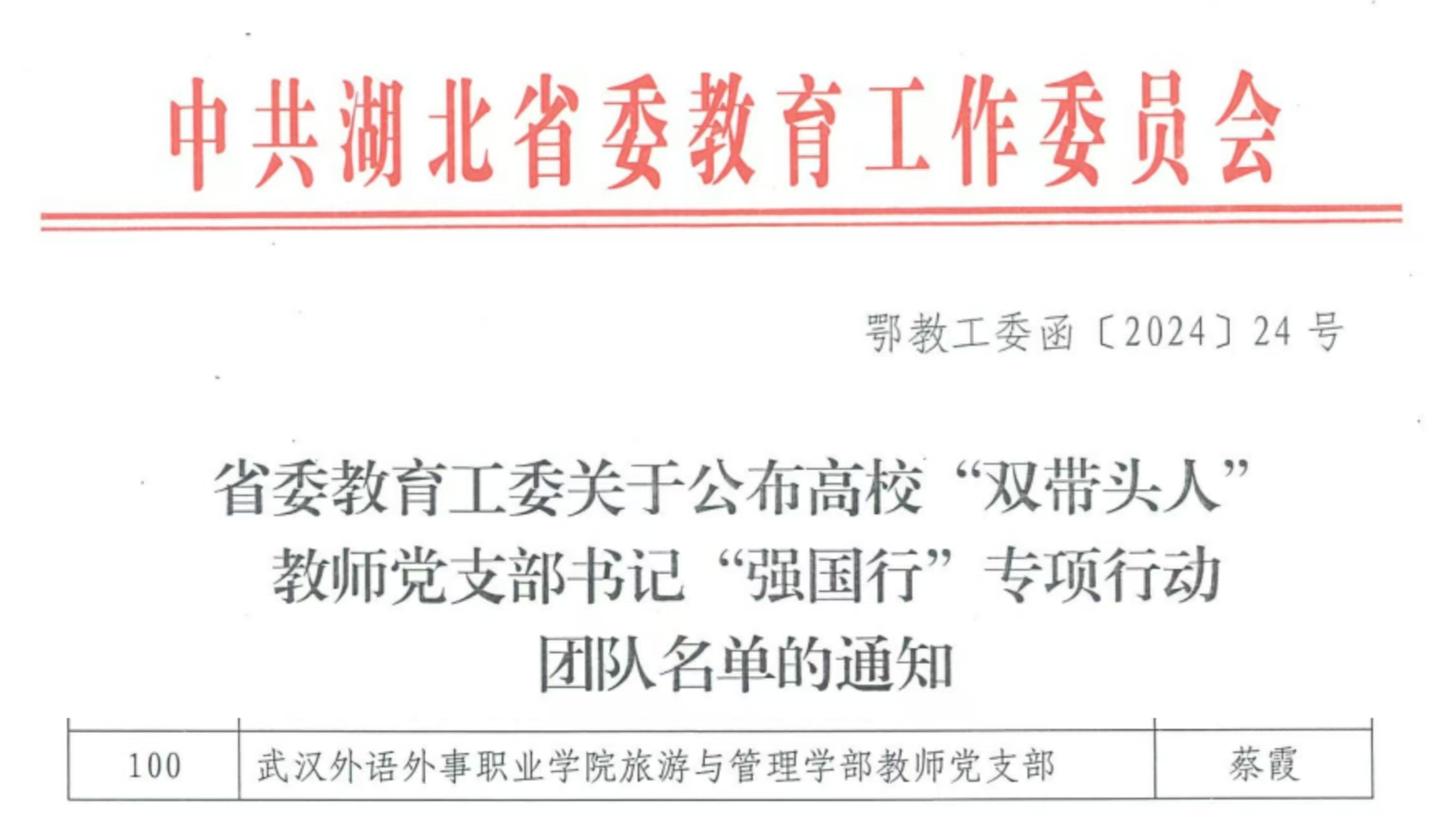 新闻网讯(通讯员 蔡霞)2024年10月23日,省委教育工委发文(鄂教工委函【2024】24号),公布高校“双带头人”教师党支部书记“强国行”专项行动团队名单,我校旅游与管理学部教师党支部光荣入选。这是学部教师党支部继立项全省高校教师党支部书记“双带头人”工作室后,在支部党建特色创建方面获得的第2项省级荣誉。