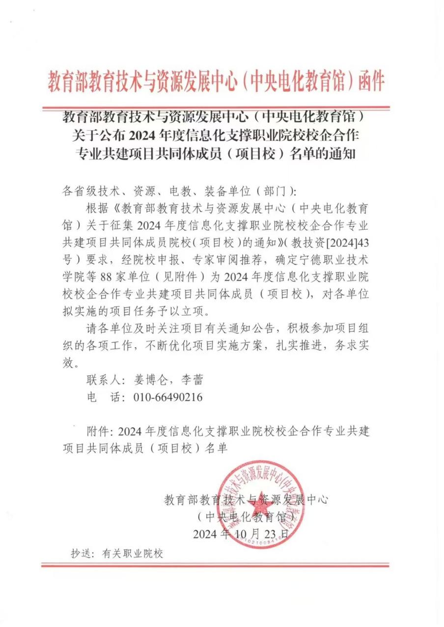 新闻网讯(通讯员 郭志颖)近日,教育部教育技术与资源发展中心(中央电化教育馆)公布了2024年度信息化支撑职业院校校企合作专业共建项目共同体成员(项目校)名单。经过院校申报、专家审阅推荐等严格程序,最终确定88家单位成功入选。其中,我校财经与商贸学部申报的跨境电商专项项目荣誉在列。