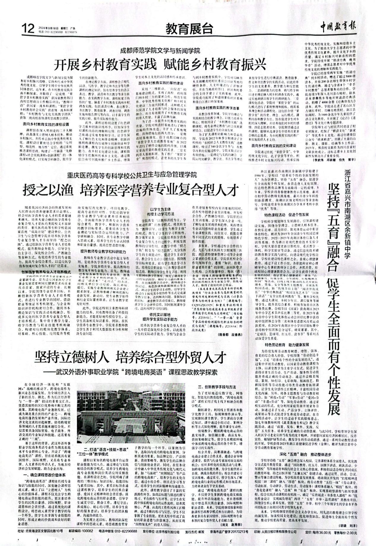 新闻网讯(记者 刘佳琪 沈妍)近日,我校应用外国语学部应用英语系副主任刘文、实验室主任赵秀丽在《中国教育报》上发表了一篇题为《坚持立德树人 培养综合型外贸人才——武汉外语外事职业学院“跨境电商英语”课程思政教学探索》的文章。