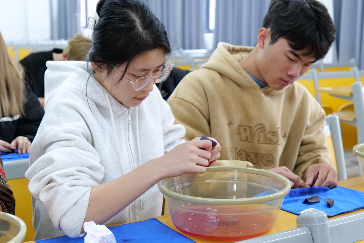 在制作过程中,每位学生旁边均备有一个小胶盆和一条清洁毛巾。他们按照于祥志先生的指导,先用三种不同粗细的砂纸进行水磨,由粗到细,逐渐将图案显现出来。尽管水磨的过程略显繁琐,但学生们却乐在其中,他们小心地蘸取盆中的水,精心打磨每一处细节。随着时间的推移,图案愈发清晰,一面是栩栩如生的生肖图案,另一面则是神秘莫测的傩面具图案。