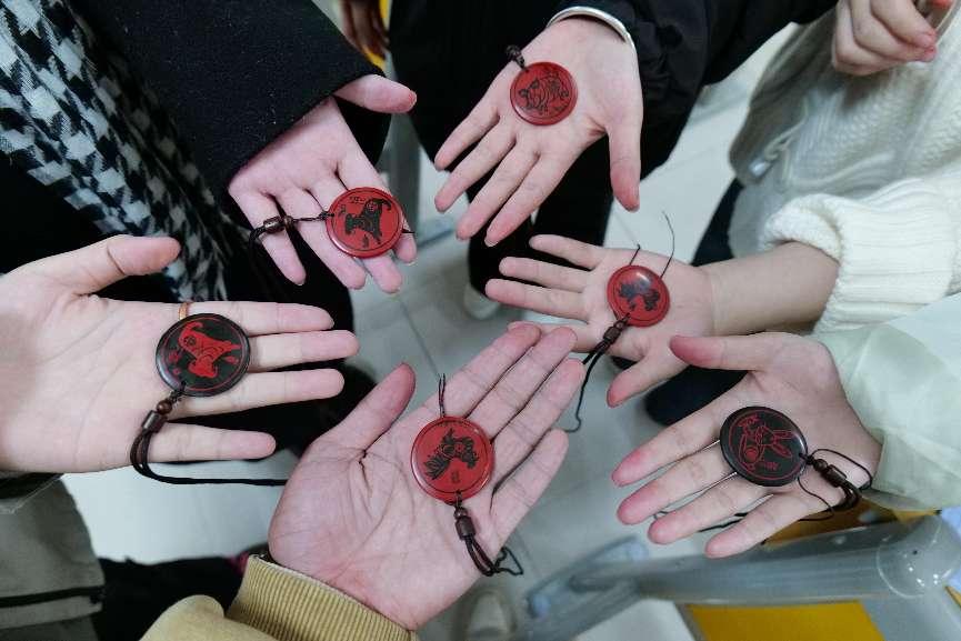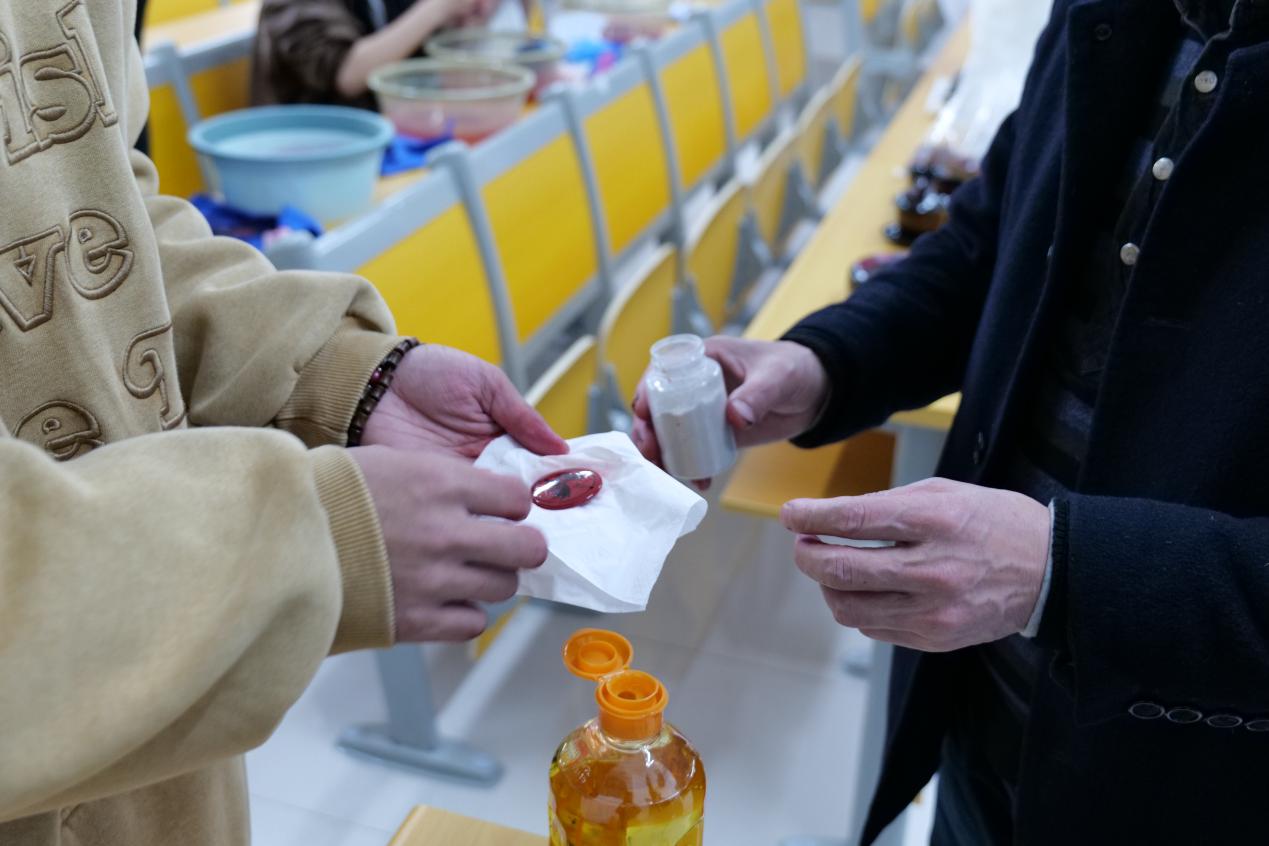 完成水磨步骤后,学生们紧接着进入推光环节。他们先在纸巾上浸润菜籽油,均匀涂抹于项坠表面,随后利用瓦灰进行细致推光,使项坠呈现出更加光滑细腻的质感。最后,学生们将绳子穿过项坠孔洞,一款精致的“傩福生肖扣”便制作完成。