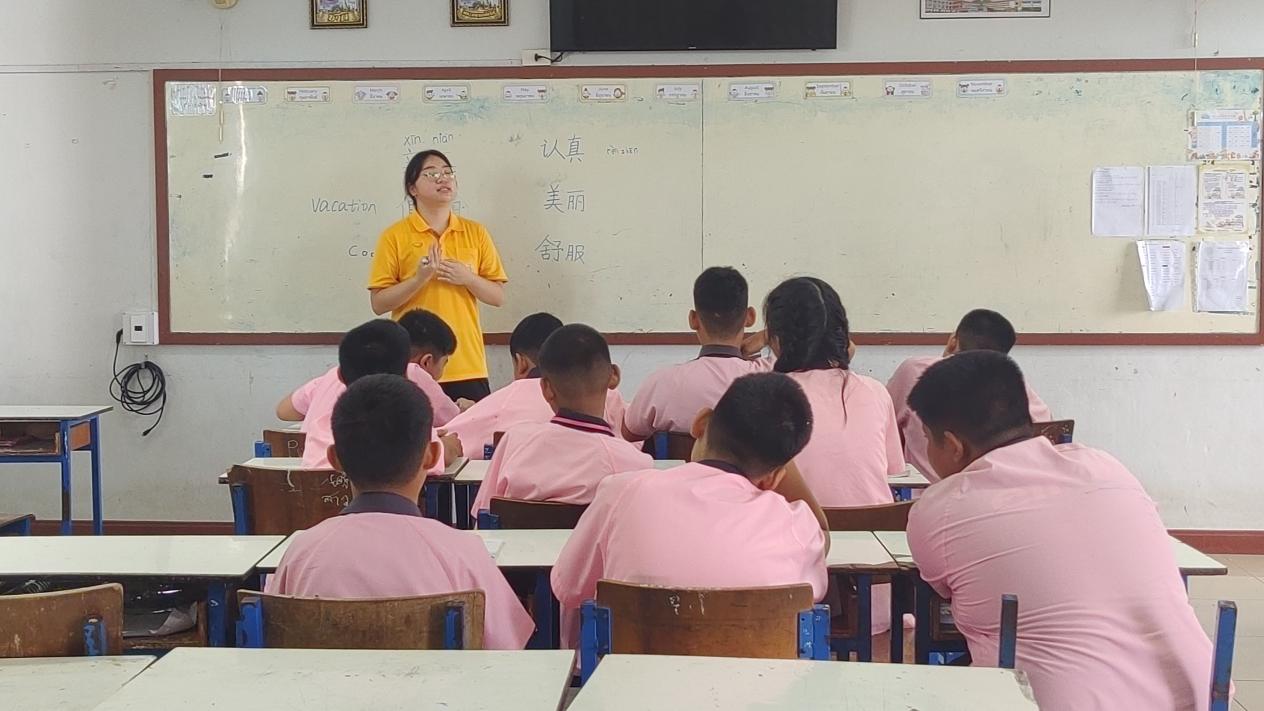 在泰国实习期间,金秋艳主要负责高中学部的英语授课。面对语言环境的差异,她付出了许多的努力:她精心准备教案和PPT,巧妙运用游戏化教学,让课堂氛围变得生动有趣;当遇到复杂的词汇或句子时,她会先用简单的汉语进行解释,再用英语进行补充,并提前查阅泰文释义,以确保学生能够完全理解。她的教学方法深受学生喜爱,她也同学生们建立了深厚的师生情谊。