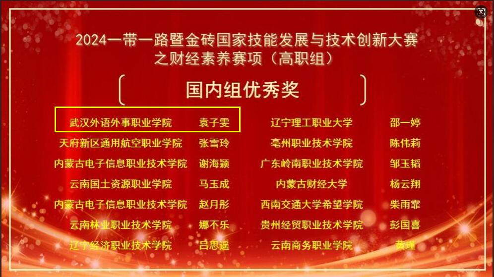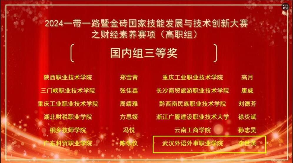 新闻网讯(通讯员 王玉亭)近日,2024年一带一路暨金砖国家技能发展与技术创新大赛之财经素养赛项全国总决赛圆满落幕。我校财经与商贸学部大数据与会计专业两位优秀学子李世英和袁子雯,在此次国家级竞赛中脱颖而出,分别荣获全国总决赛(高职组)国内组三等奖和优秀奖,为我校赢得了荣誉。