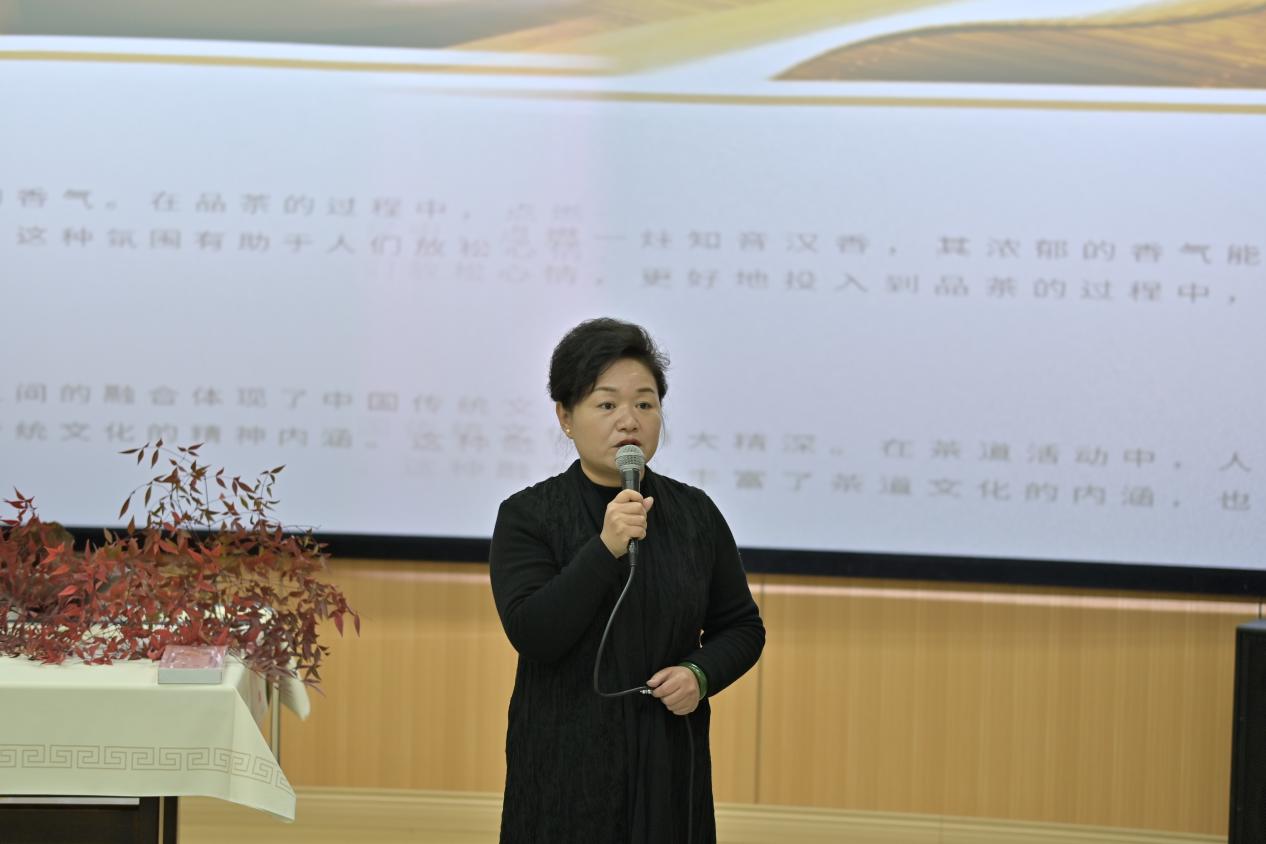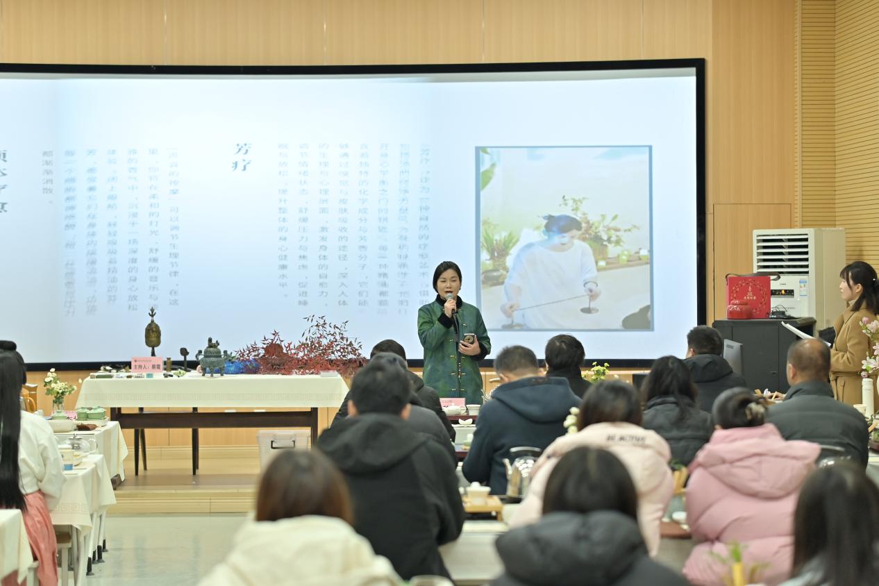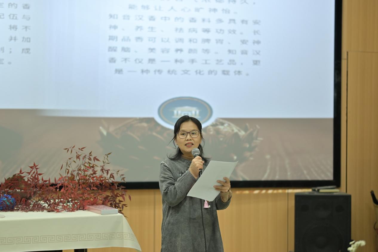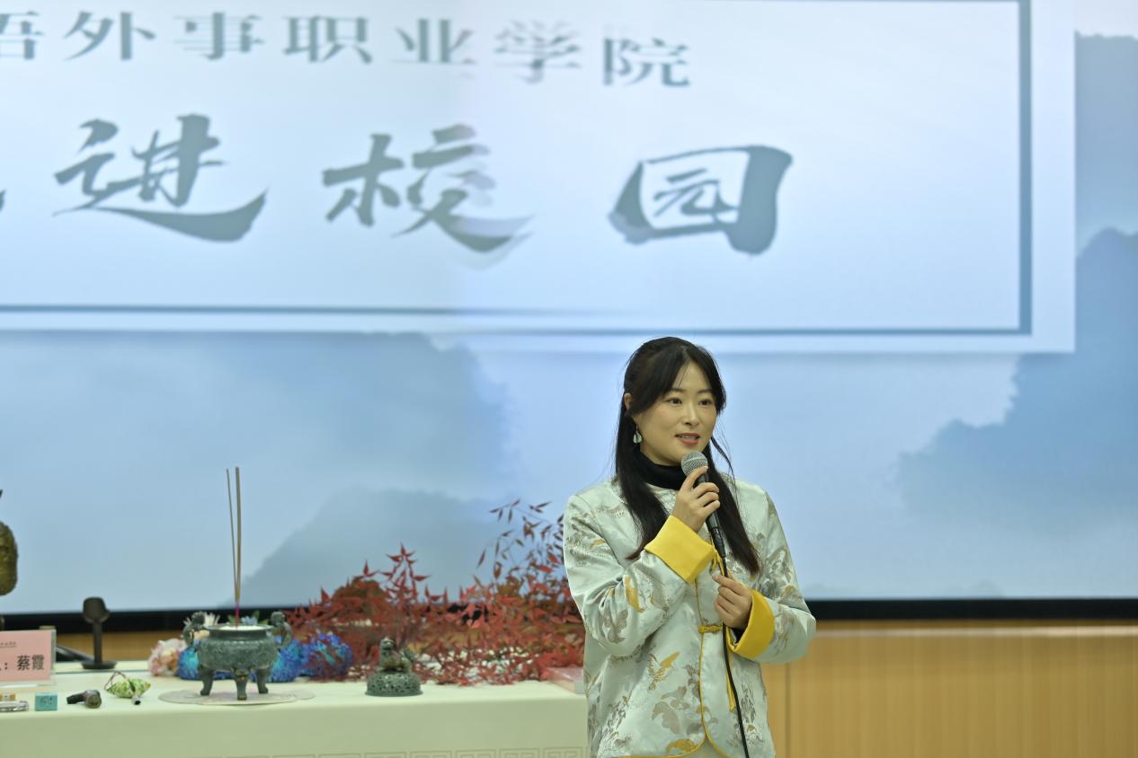 随后,三位非遗传承人——花道非遗传承人柯杏林、茶艺非遗传承人雷丽萍、香道非遗传承人曹艺馨逐一上台进行了自我介绍。她们不仅分享了各自在非遗文化传承中的经历和感悟,还表达了对学校美育教育的支持和期待。她们表示,非常荣幸能够有机会走进校园,与师生们共同分享非遗文化的魅力,希望未来能够与学校开展更多的合作与交流。