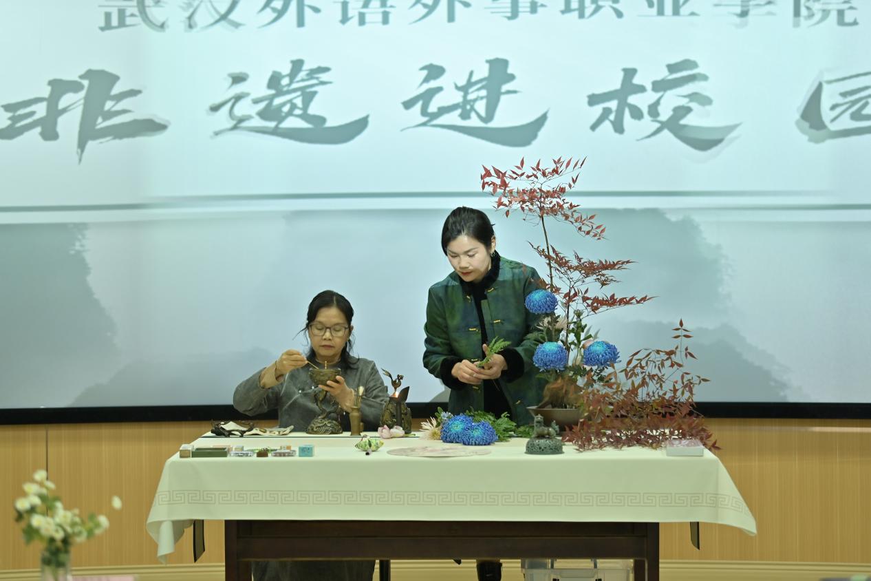 教师代表康思超表示将努力学习非遗技艺,将其融入日常教学中,为传承和弘扬非遗文化贡献自己的力量。随后,柯杏林、曹艺馨两位传承人分别进行了花道和香道的展示,她们专注的态度、独特的创意精湛的手艺赢得了在场师生的掌声和赞叹。