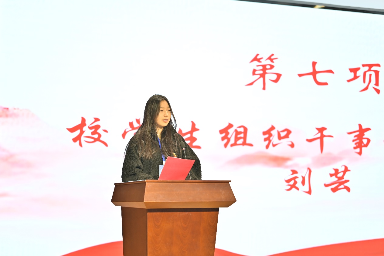 刘芸作为校团委学生组织干事代表发言。她表示,学生组织是学生们共同成长的舞台,是探索自我、挑战自我、超越自我的平台。她强调,学生干部要勇于担当,在挑战中磨砺自我,不仅在学业上争先,更要在品德上树标。她呼吁大家在团结中锻炼成长,用实际行动书写青春。