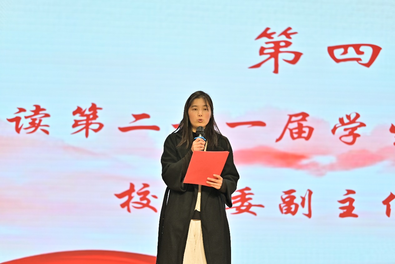 校团委副主任周青宣读了第二十一届校团委学生组织、学生会的任命文件,并对新一届学生干部提出了具体要求和殷切期望。她强调,学生干部应严格遵守学校规章制度,树立良好形象,发挥榜样作用,同时不断提升自身综合素质,为学校建设与发展贡献力量。