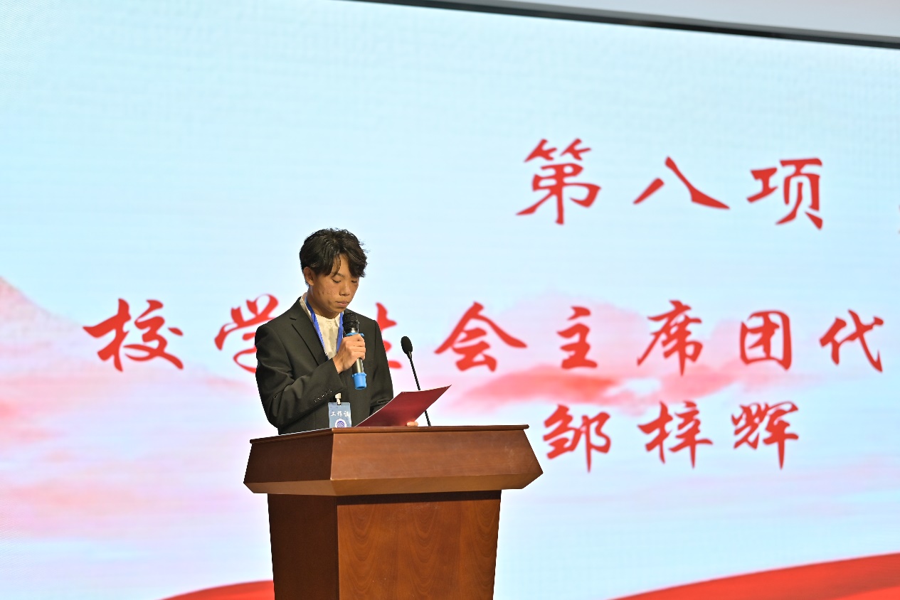 邹梓辉作为校学生会主席团代表进行发言。他向一直以来支持和关心学生会工作的师生们表示衷心感谢。他表示,校学生会作为学校与学生之间的桥梁和纽带,将始终牢记使命、勤勉敬业,以全心全意服务同学为宗旨,在学习与工作中不断成长,取得更大的进步。