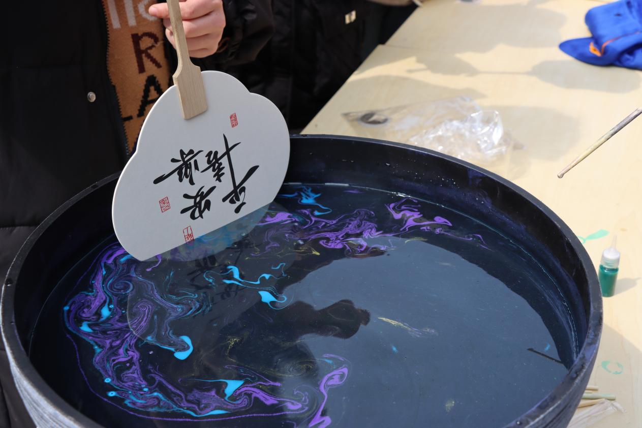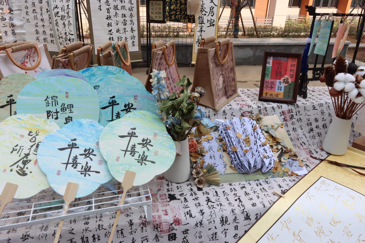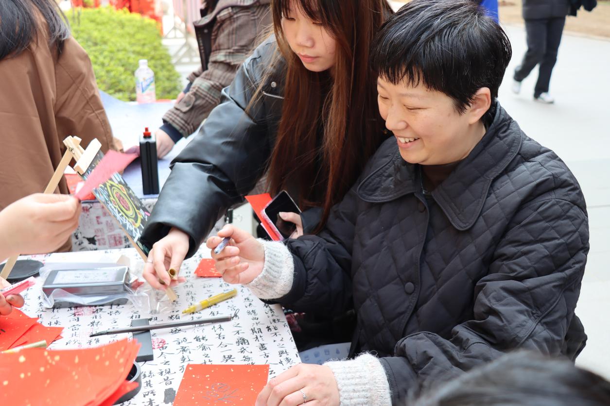 聚人才体验区则是本次活动的亮点之一。该区域设置了书法环保展、软笔作品展以及丰富的体验活动。其中,制作非遗漆扇和非遗书签的体验活动尤为受欢迎。同学们亲手制作漆扇和书签,不仅了解了非遗文化的魅力,还体验到了传统手工艺的乐趣。此外,现场还设有写书签和集章活动,同学们可以用毛笔在红纸上写下福字,集齐印章后参与抽奖,有机会获得非遗漆扇或书签等精美奖品。