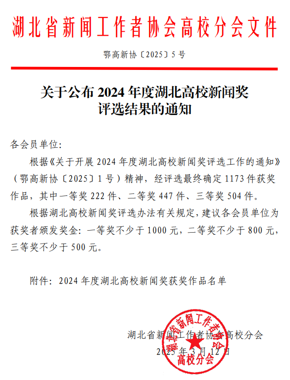 “湖北高校新闻奖”由湖北省新闻工作者协会高校分会主办,是全省高校范围内综合性年度优秀新闻作品的最高荣誉,每年评选一次。2024年度评选涵盖文字消息、文字评论、通讯与深度报道、版面和页(界)设计、新闻摄影、广播等11大类。