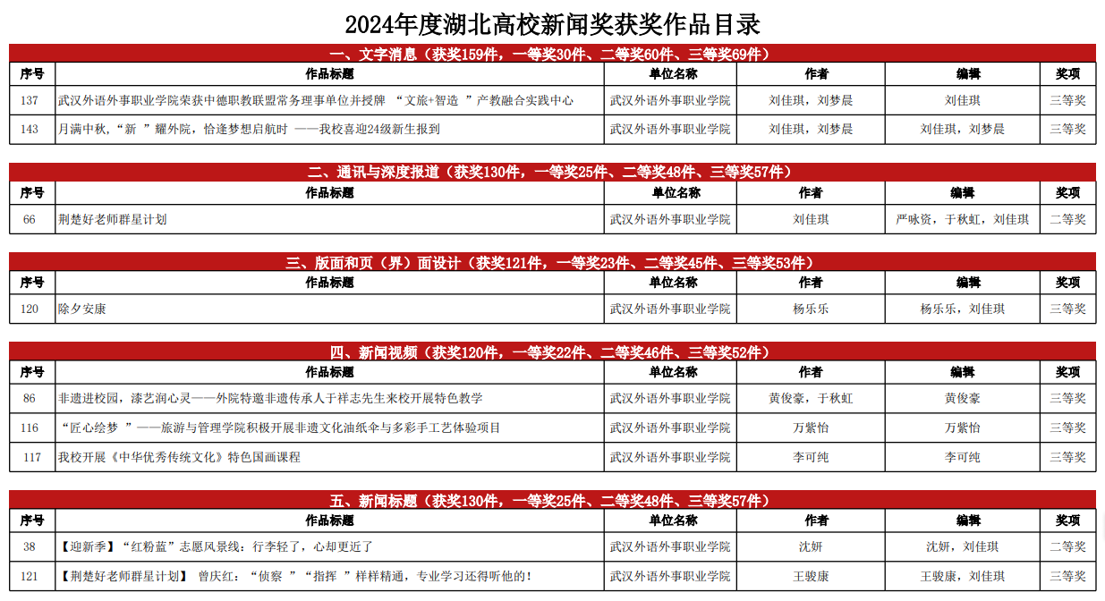 在2024年度湖北高校新闻奖获奖作品中,由记者刘佳琪、刘梦晨采写的两件作品《武汉外语外事职业学院荣获中德职教联盟常务理事单位并授牌 “文旅+智造 ”产教融合实践中心》和《月满中秋,“新 ”耀外院,恰逢梦想启航时——我校喜迎24级新生报到》均荣获文字消息类三等奖;由记者刘佳琪采写的【荆楚好老师群星计划】系列作品《梁川飞:培养超4000名高铁乘务精英,她是“动姐班”背后的教育领航者,更是高铁教育的新标杆》,由记者严咏资采写的【荆楚好老师群星计划】系列作品《黄羽婷:跨越七载海外归途,一心任教坚守讲台,只为将学到的先进专业知识教给学生!》,由记者于秋虹、刘佳琪采写的【荆楚好老师群星计划】系列作品《王庭薇:非遗传承、匠心筑梦,她全面创新课程教学,只为铸就设计新星!》共获通讯与深度报道类二等奖;由记者杨乐乐、刘佳琪设计制作的大图作品《除夕安康》荣获版面和页(界)面设计类三等奖;由记者黄俊豪、于秋虹采写拍摄剪辑制作的作品《非遗进校园,漆艺润心灵——外院特邀非遗传承人于祥志先生来校开展特色教学》,实习记者万紫怡采写拍摄编辑制作的作品《“匠心绘梦 ”——旅游与管理学院积极开展非遗文化油纸伞与多彩手工艺体验项目》,记者李可纯采写拍摄编辑制作的作品《我校开展〈中华优秀传统文化〉特色国画课程》分别荣获新闻视频类三等奖;由记者沈妍、刘佳琪编辑的作品《【迎新季】“红粉蓝”志愿风景线:行李轻了,心却更近了》荣获新闻标题类二等奖,由记者王骏康、刘佳琪编辑的作品《【荆楚好老师群星计划】曾庆红:“侦察”“指挥 ”样样精通,专业学习还得听他的!》荣获新闻标题类三等奖。