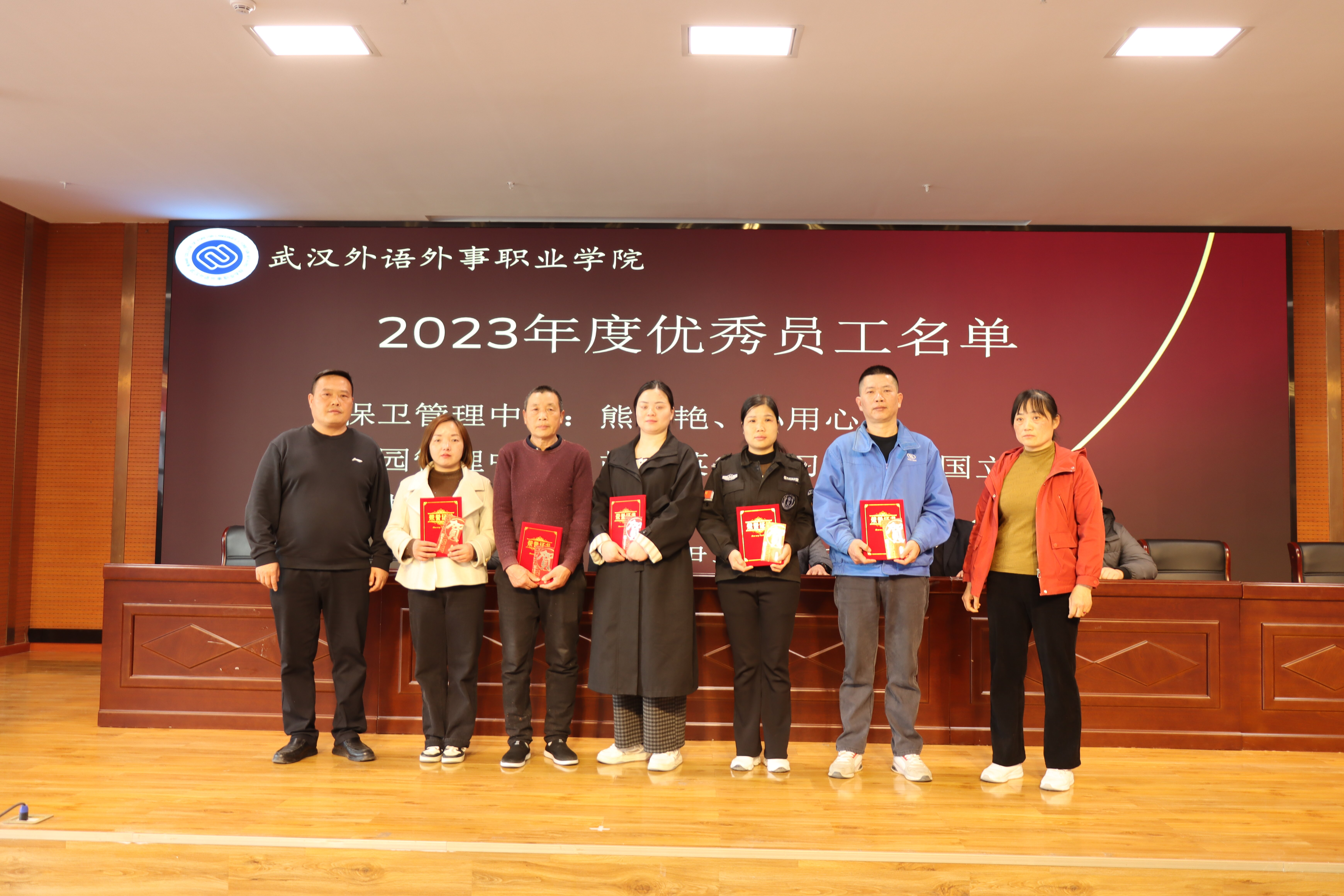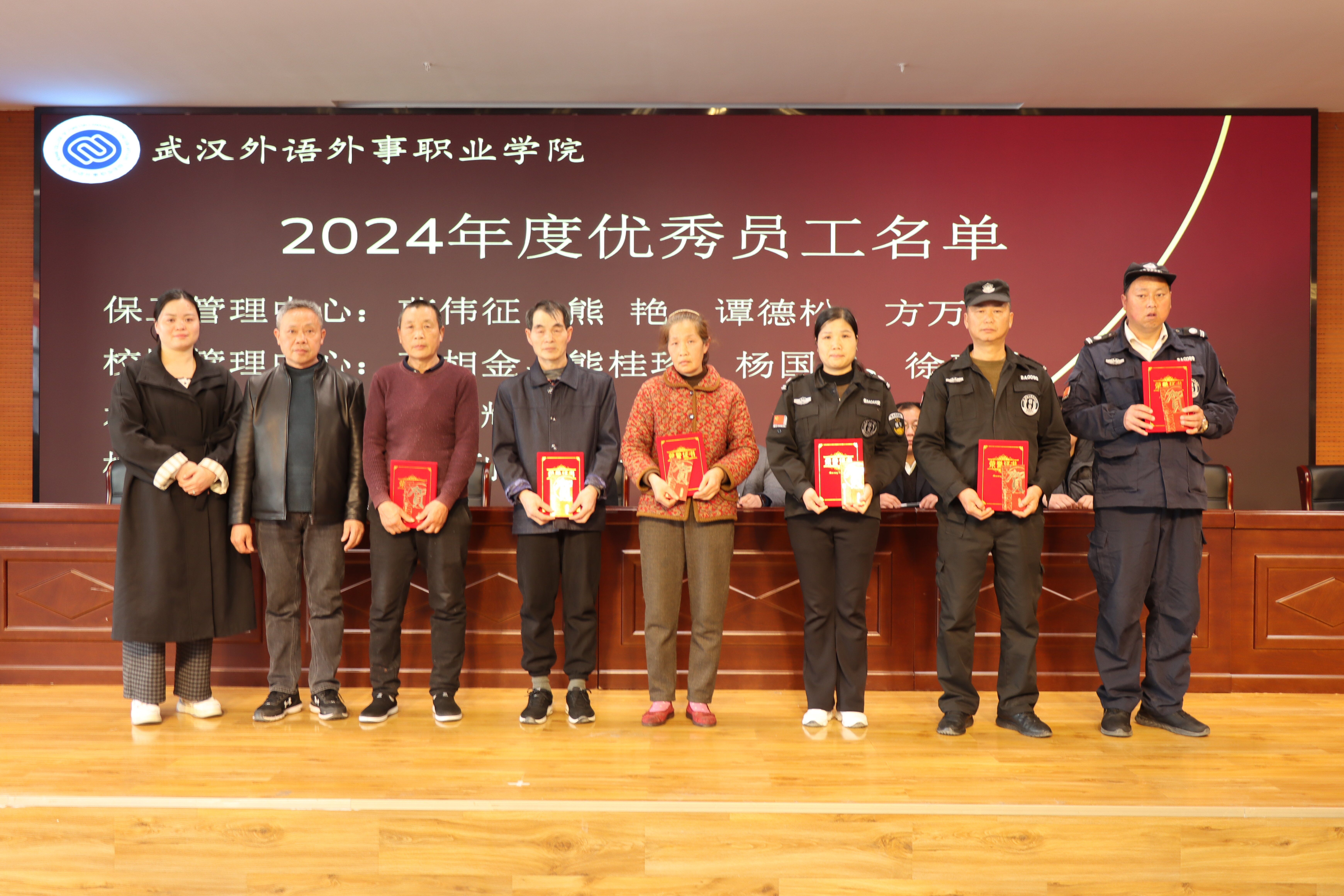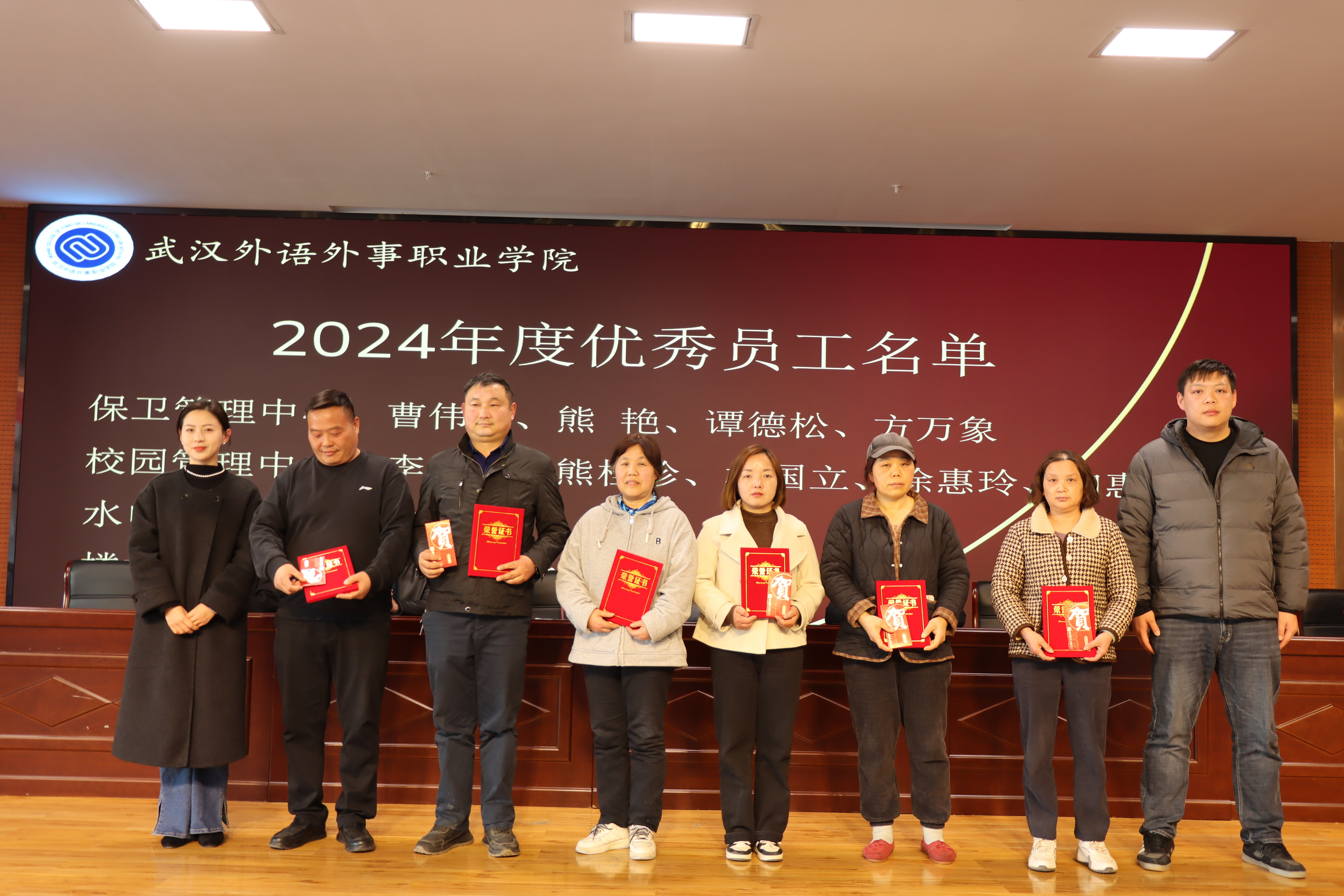 后勤保卫处副处长王波宣读了《关于表彰2023年度优秀员工的决定》和《关于表彰2024年度优秀员工的决定》。在热烈的掌声中,进入颁奖环节。甘云军、胡菊英、高习方等优秀员工分批上台领奖,由资产管理科副科长王晶、后勤保卫处后勤保卫科科员尤玄、各中心主管曹伟征、陶桂梅、叶可栋、李伊等颁奖代表为他们颁发荣誉证书,对他们过去一年的辛勤付出和重要贡献予以肯定。获奖代表发言,表达了自己在工作中的经验与感悟,激励全体后勤保卫处工作人员以此次表彰为契机,在新的一年里继续携手共进,为学校后勤保卫工作贡献更多力量。