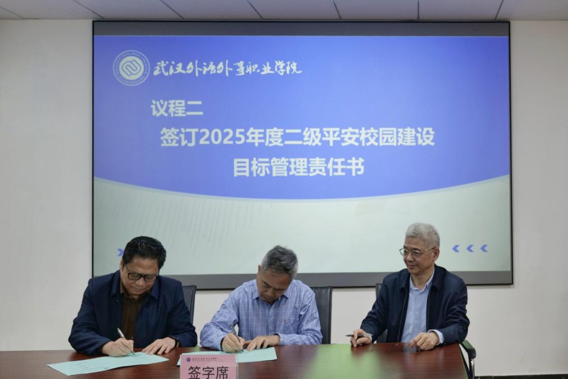 会上,校长熊仕涛、党委书记盛建龙与各职能部门负责人、各教辅单位负责人、各学院负责人签订了2025年度二级平安校园建设目标管理书,将安全责任细化至岗位、落实到个人,切实将安全管理融入日常业务工作,形成了层层抓安全、人人讲安全的工作格局。