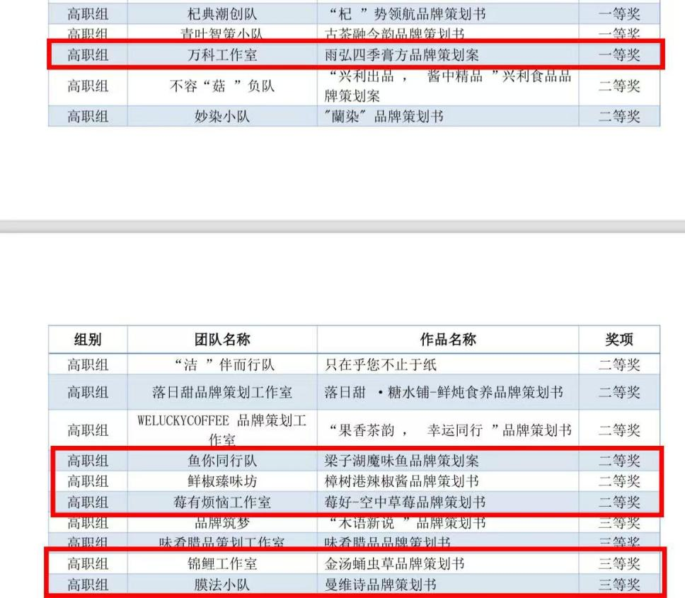 最终,万科工作室的 “雨弘四季膏方” 品牌策划案荣获省级一等奖;鱼你同行队的 “梁子湖魔味鱼”、鲜椒臻味坊的 “樟树港辣椒酱”、莓有烦恼工作室的 “莓好-空中草莓” 品牌策划书均荣获省级二等奖;锦鲤工作室的 “金汤蛹虫草”、膜法小队的 “曼维诗” 品牌策划书均荣获省级三等奖。