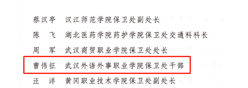 新闻网讯(记者 沈妍 刘佳琪)近日,湖北省公安厅发布《关于表扬2024年度“平安校园建设”工作成绩突出集体和个人的通报》,我校后勤保卫处干部曹伟征被评选为2024年度“平安校园建设”工作成绩突出个人称号,为学校安全保卫工作增添荣誉。