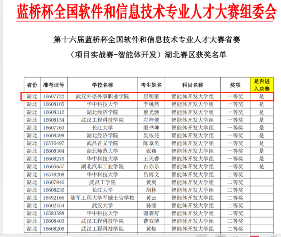 新闻网讯(记者 沈妍)近日,第十六届蓝桥杯大赛项目实战赛-智能体开发省赛、电子赛(京津冀)省赛及5G全网规划与建设省赛(以下简称蓝桥杯大赛)获奖名单正式公布。我校信息技术学院学子居明豪凭借扎实的专业技能与出色的创新能力,在湖北赛区脱颖而出,荣获一等奖,并成功晋级全国总决赛,为学校争得了荣誉。