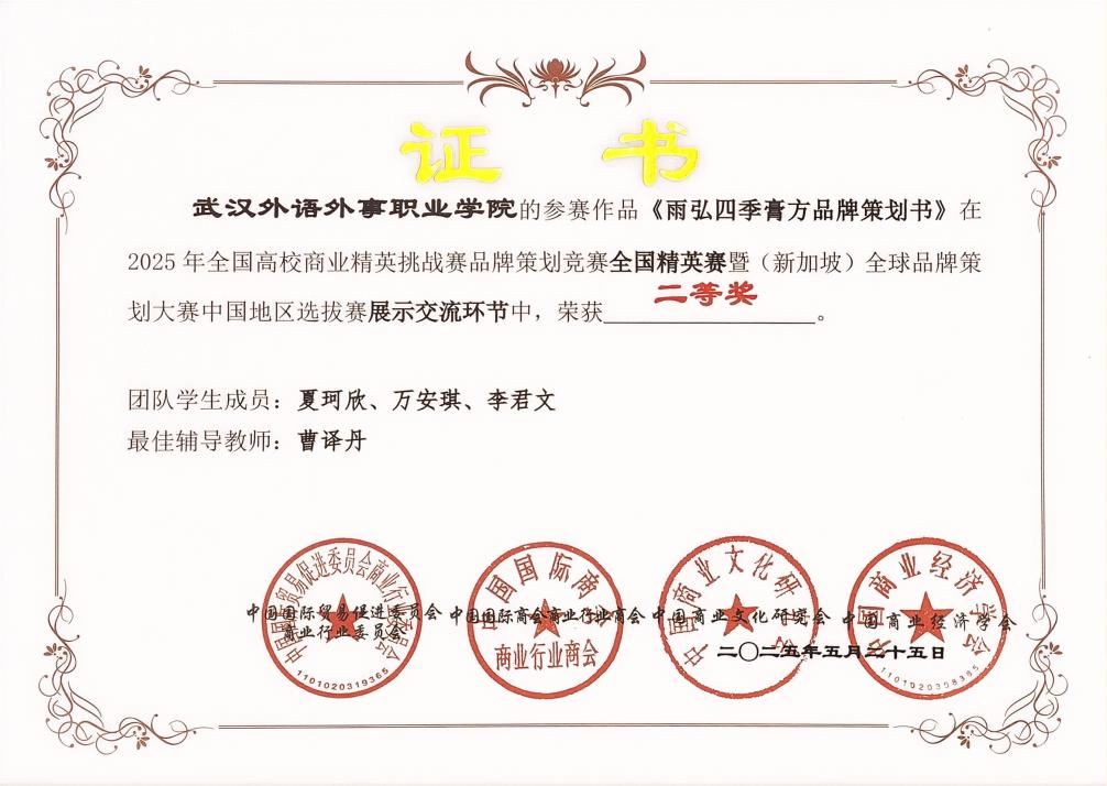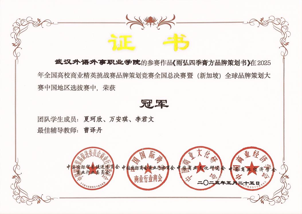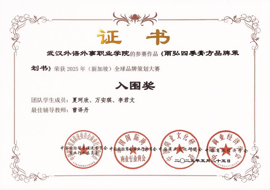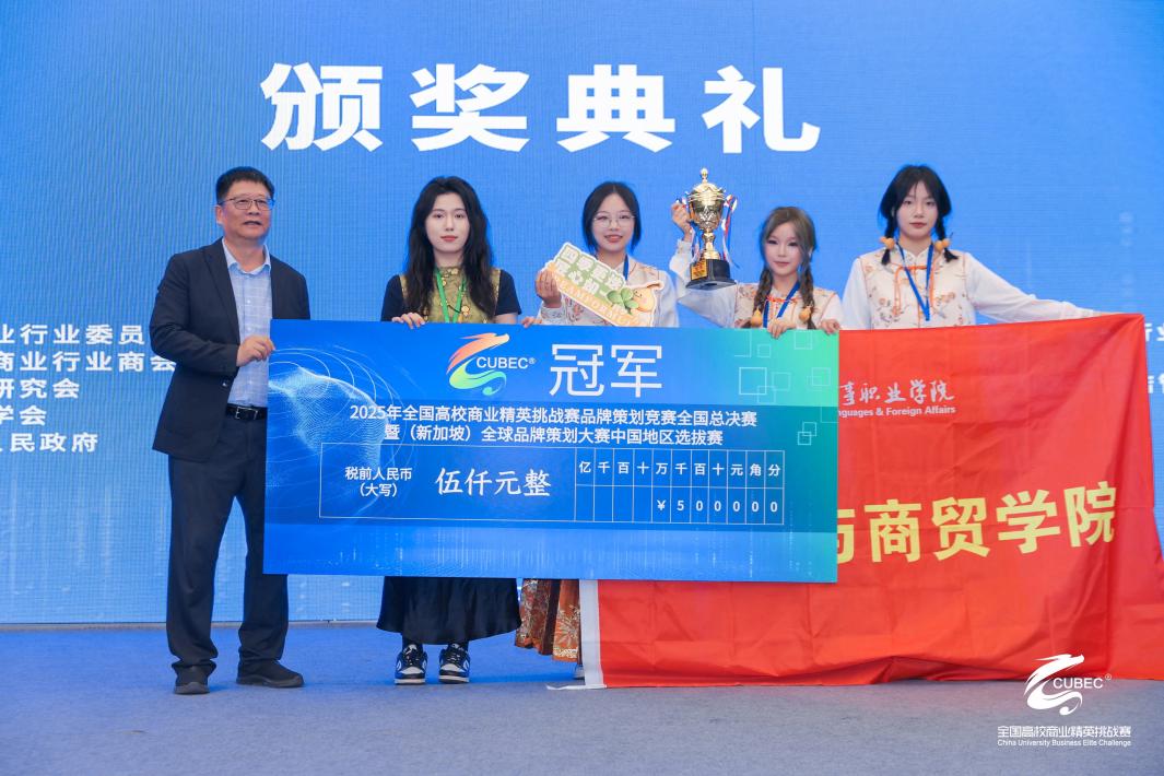 在赛后的颁奖典礼上,我校团队成为全场焦点,共斩获三项重磅奖项:2025年(新加坡)全球品牌策划大赛入围奖、2025年全国高校商业精英挑战赛品牌策划竞赛全国精英赛暨全球品牌策划大赛中国地区选拔赛展示交流环节二等奖、2025年全国高校商业精英挑战赛品牌策划竞赛全国总决赛暨(新加坡)全球品牌策划大赛中国地区选拔赛冠军。这一成绩不仅彰显了学校在品牌策划领域的领先水平,也为学校赢得了荣誉。