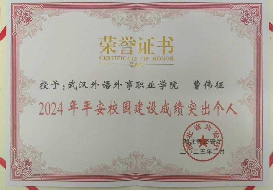 凭借着出色的工作表现和无私的奉献精神,曹伟征在湖北省公安厅发布的《关于表扬2024年度“平安校园建设”工作成绩突出集体和个人的通报》中,被评选为2024年度“平安校园建设”工作成绩突出个人。面对这份荣誉,他保持谦逊的态度,表示这份荣誉不仅属于他个人,更属于全体后勤保卫处的成员。他深知,是大家的共同努力和日夜坚守,才使得校园安全防线更加牢固。“安全无小事,责任重于山。”这是曹伟征常挂在嘴边的一句话,也是他始终坚守的信念。