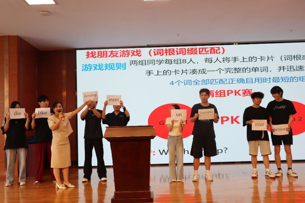 为增强活动的互动性,现场还设置了“猜单词游戏”和“词根词缀匹配”两个趣味环节,让大家在轻松愉快的氛围中体验英语的实用性和趣味性。在猜单词游戏中,参赛者通过肢体语言传递单词含义,考验了团队默契与词汇储备;而词根词缀匹配游戏则以竞赛形式帮助同学们巩固构词法知识,为专升本英语词汇学习提供了实用技巧。