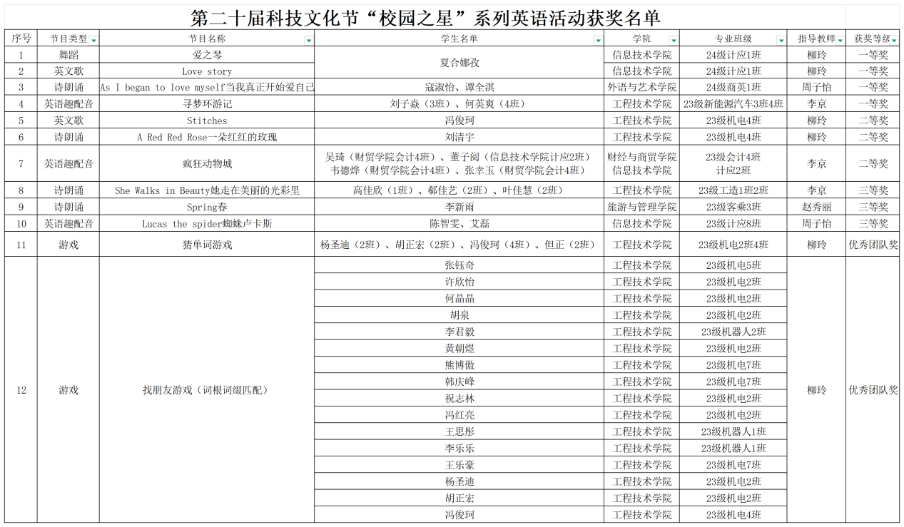 此次活动参与学生均来自学校2023级专升本学科素养班,活动通过英文歌曲翻唱、英语诗朗诵、英语趣配音等丰富形式,激发了同学们的英语学习兴趣,充分展现了同学们的英语学习成果。