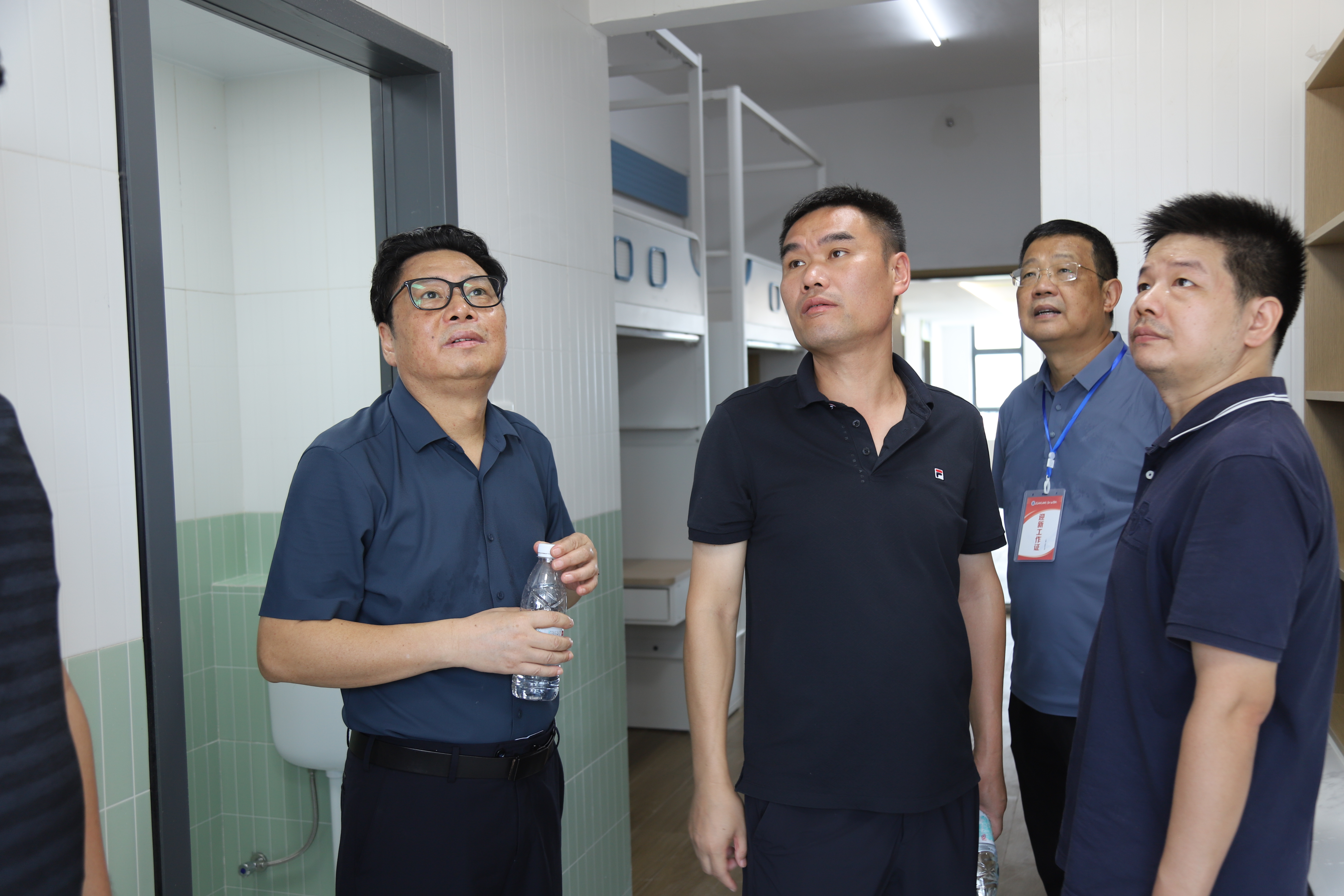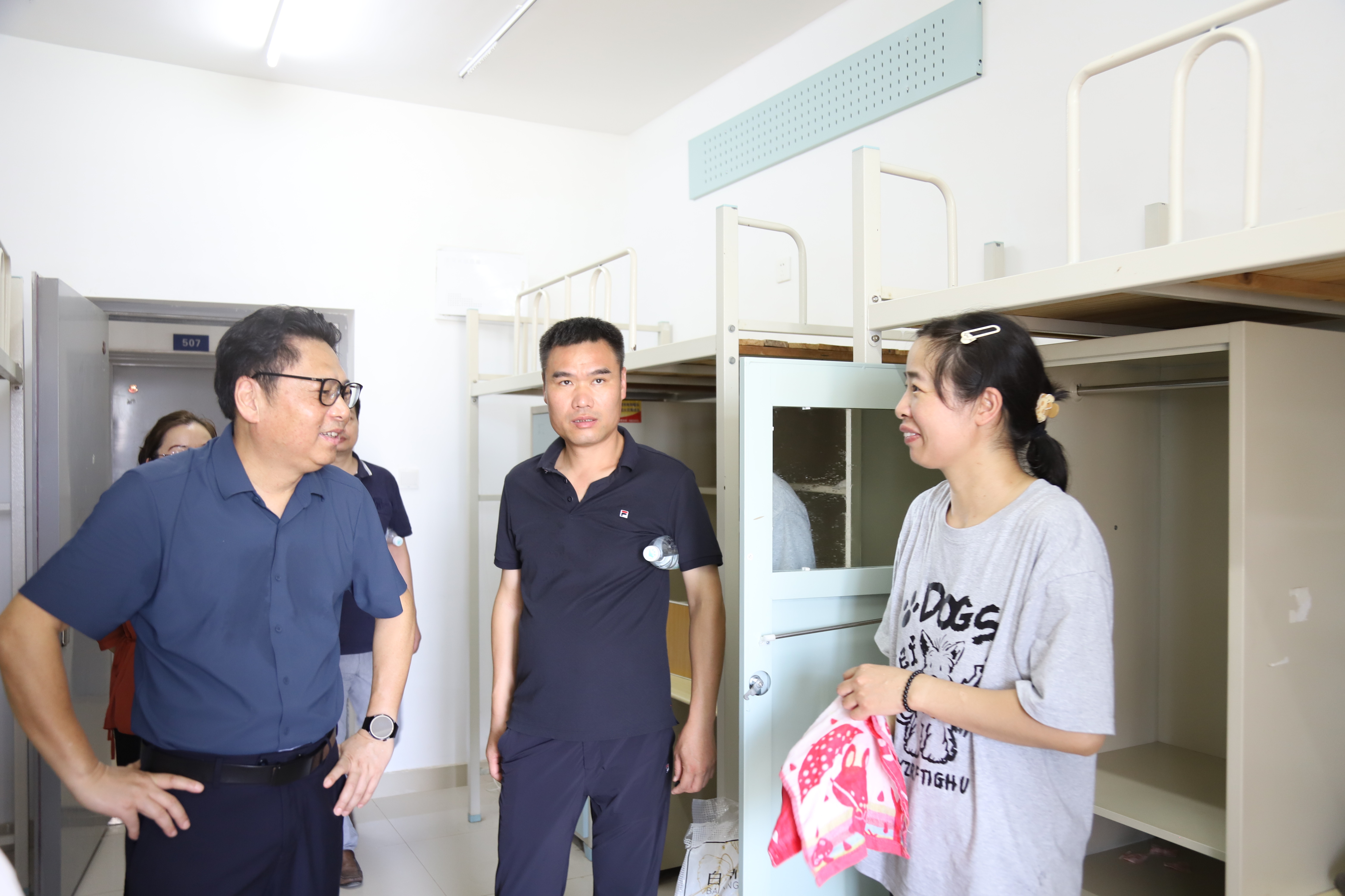 在学生宿舍区域内,校长熊仕涛逐一查看床铺、衣柜、书桌、空调、热水供应等设施的安装调试情况;同时,还驻足查看宿舍文化墙的设计,强调要营造积极向上的住宿氛围,让新生增强归属感。